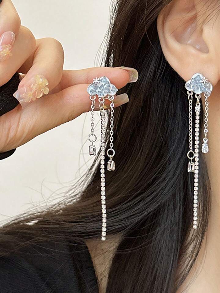 Kawaii 1pair Women's Unconventional Design Blue Crystal Cloud Tassel Earrings