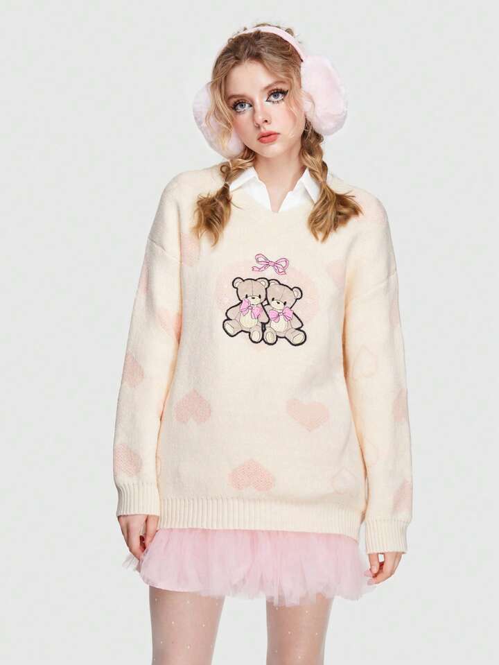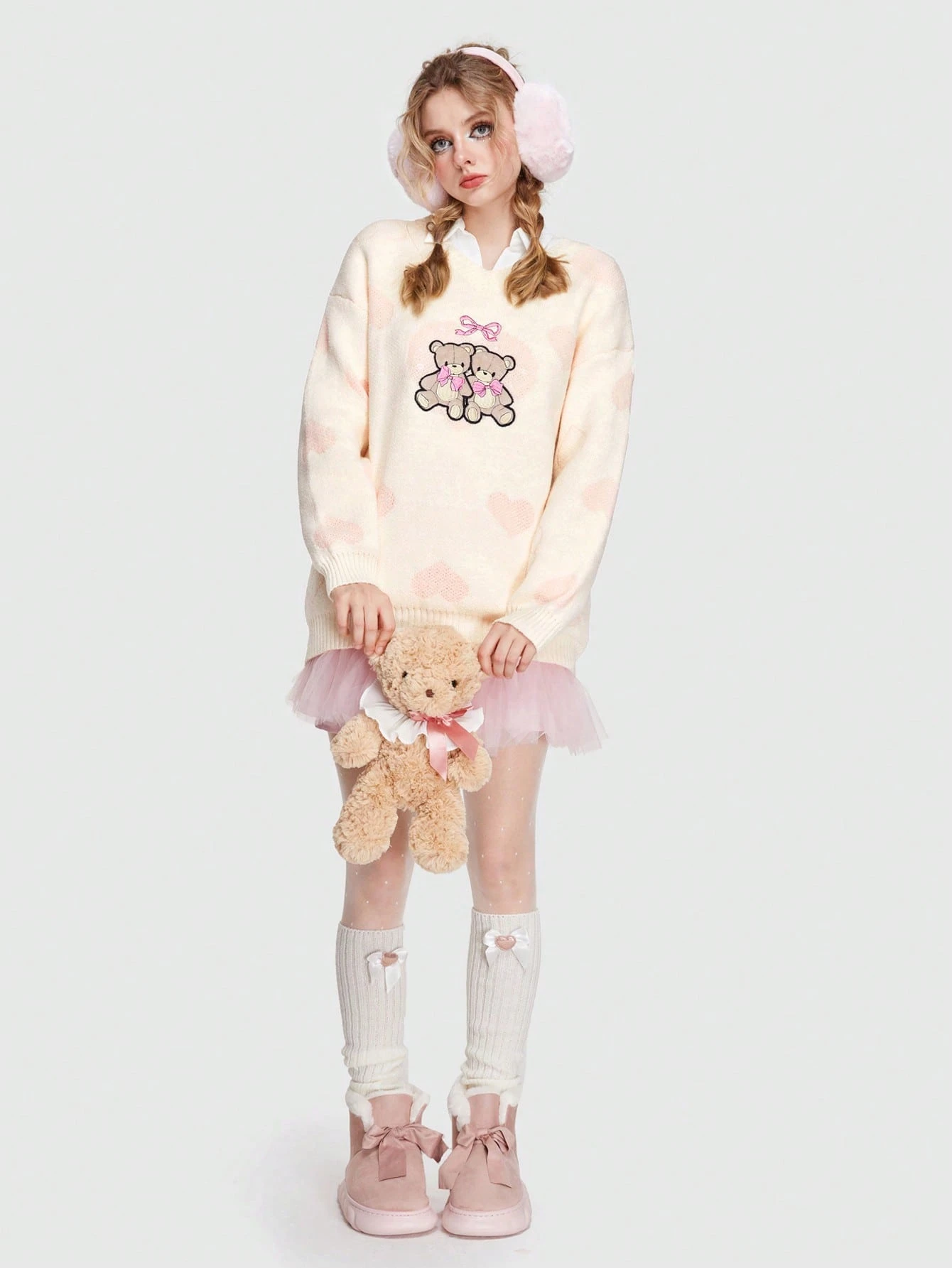 Kawaii 1pc Cartoon & Heart Pattern Drop Shoulder Sweater