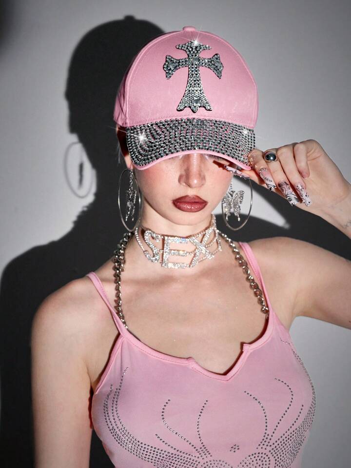 Kawaii 1pc Cross Rhinestone Baseball Cap, Y2K Style, Pink Design Casual Snapback, Fashionable Everyday Personal Streetwear Accessory