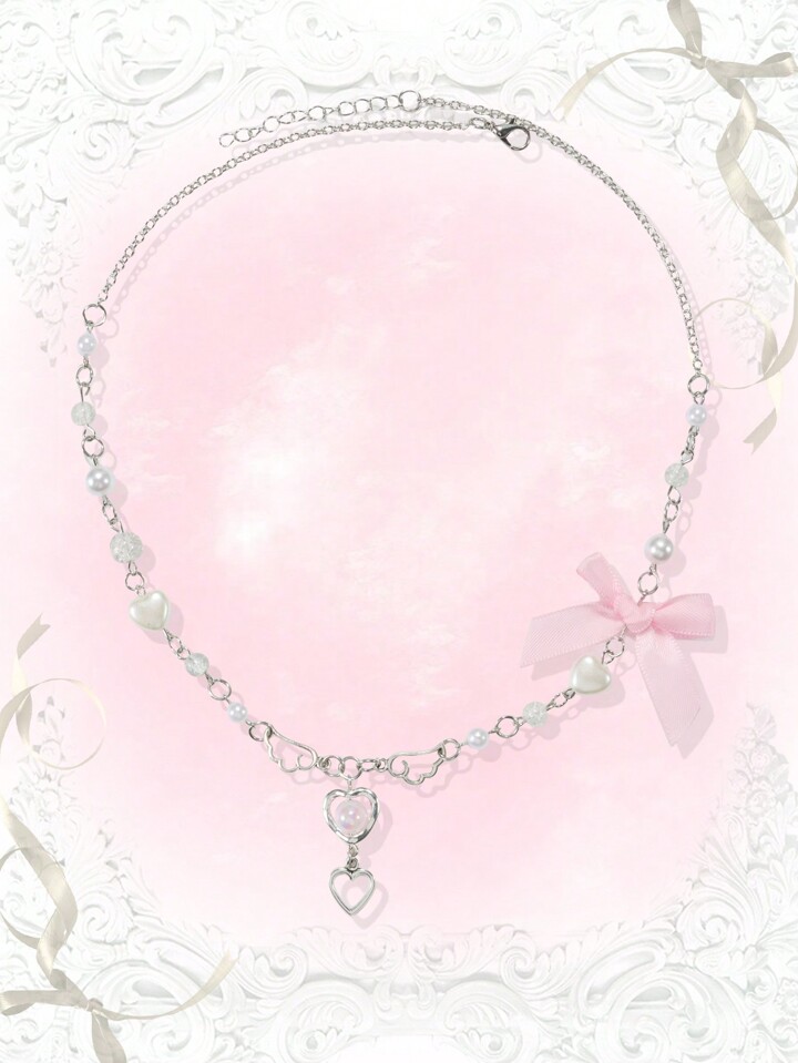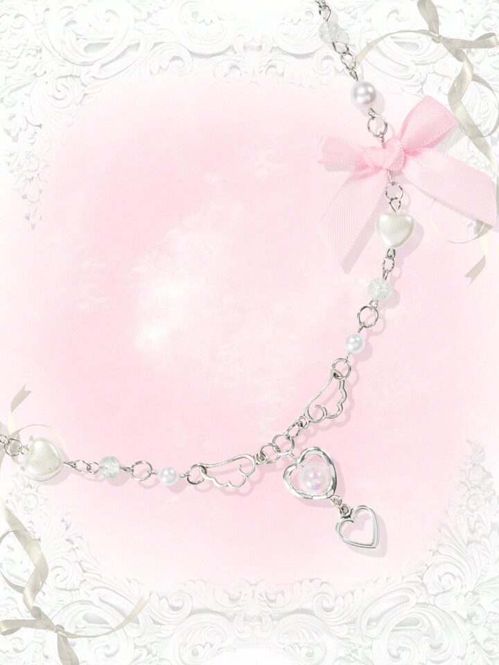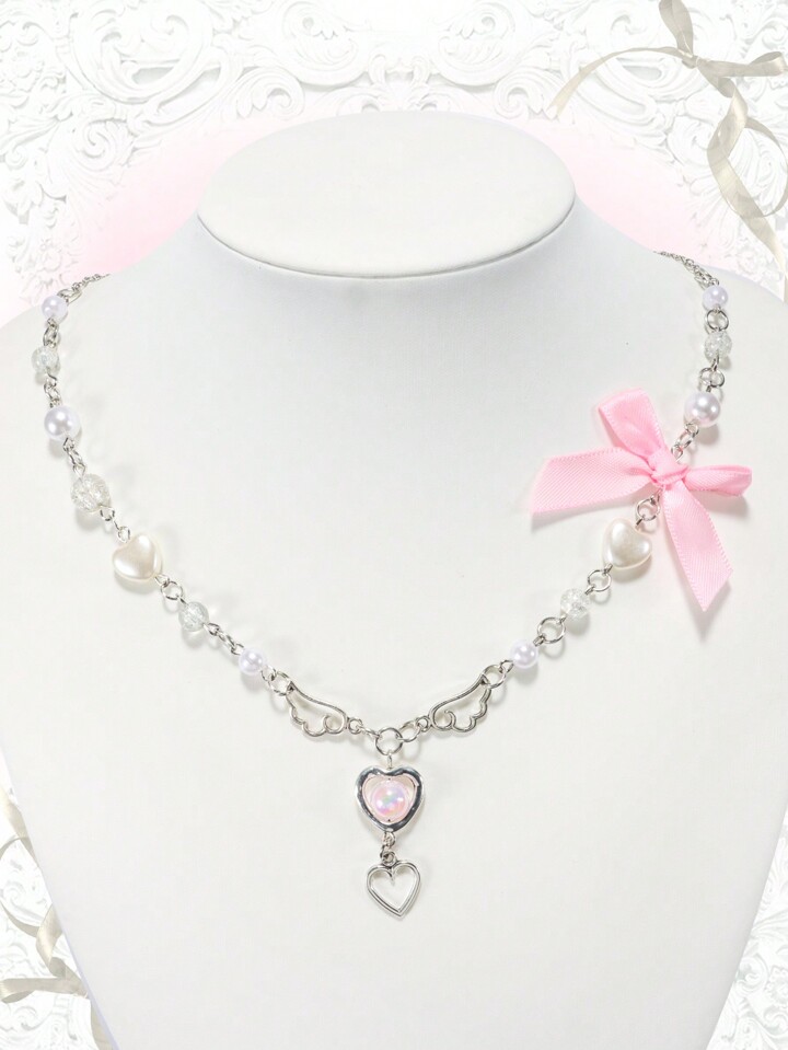 Kawaii 1pc Cute Bow Wing & Heart Pendant Necklace