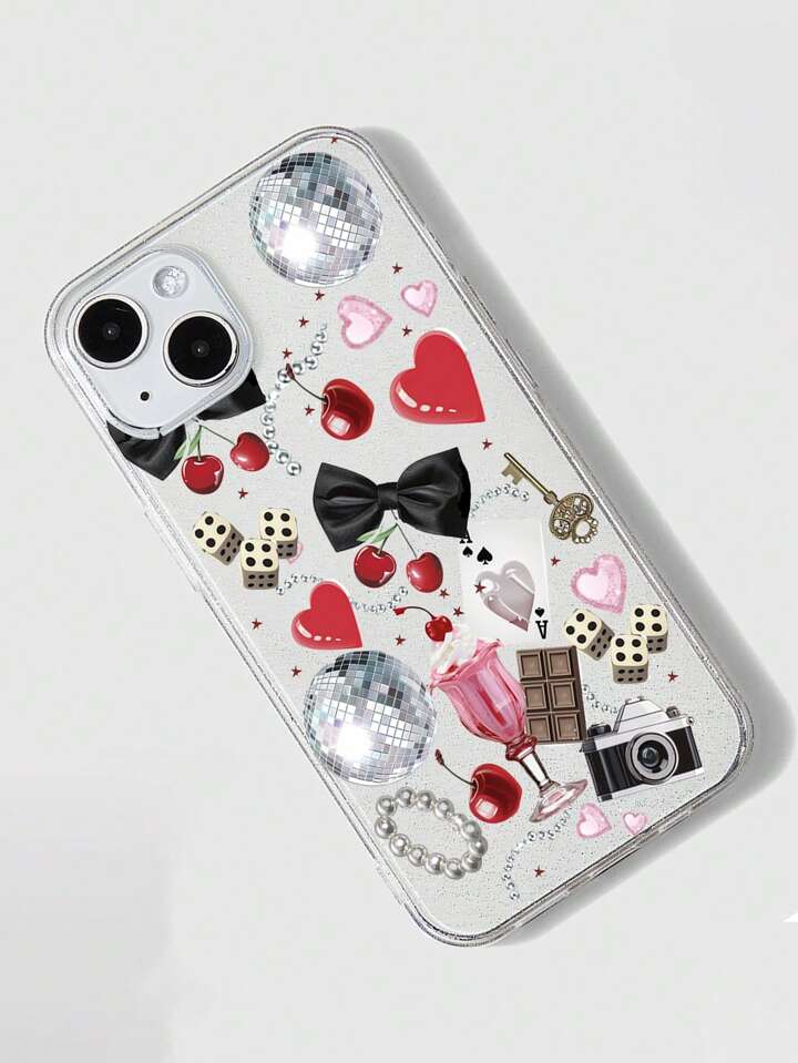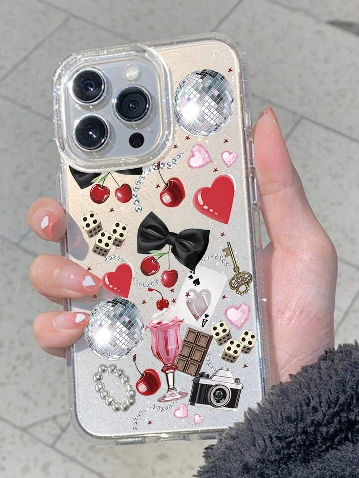 Kawaii 1pc Cute Chocolate Bow Cherry Print Glitter Bling Phone Case, Compatible With IPhone 11 12 13 14 15 Pro Max 16 16Pro 16Plus 16ProMax
