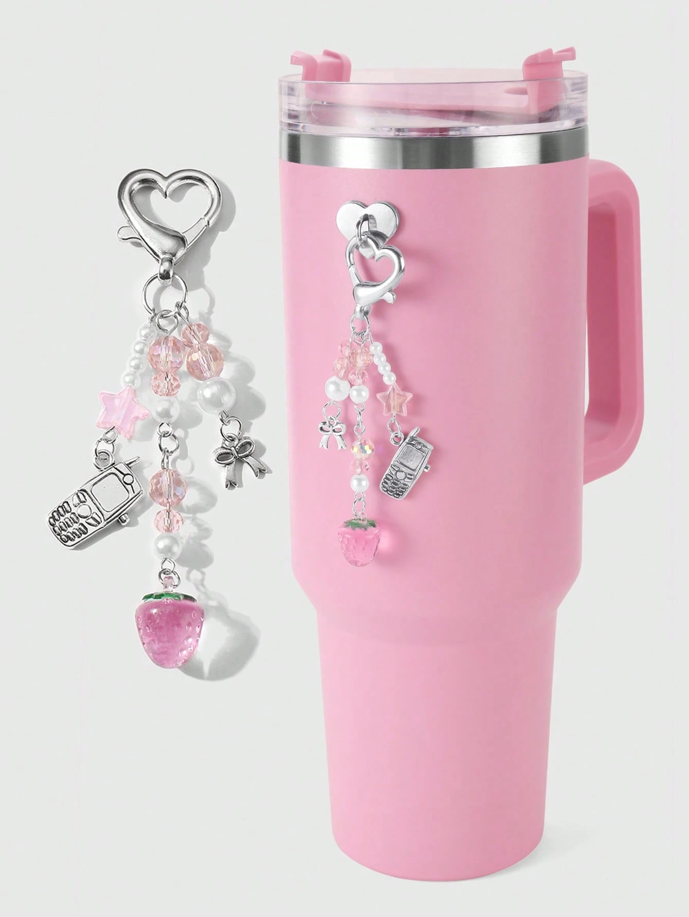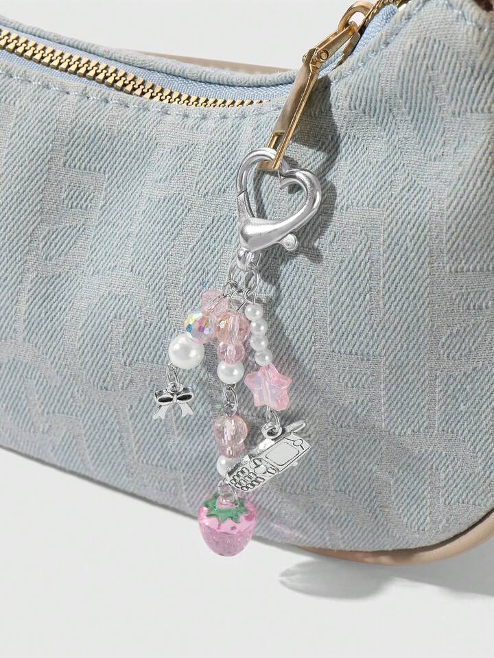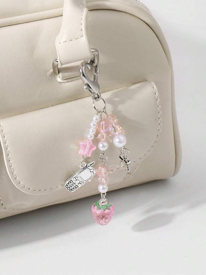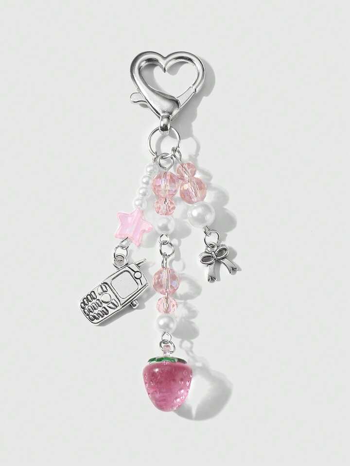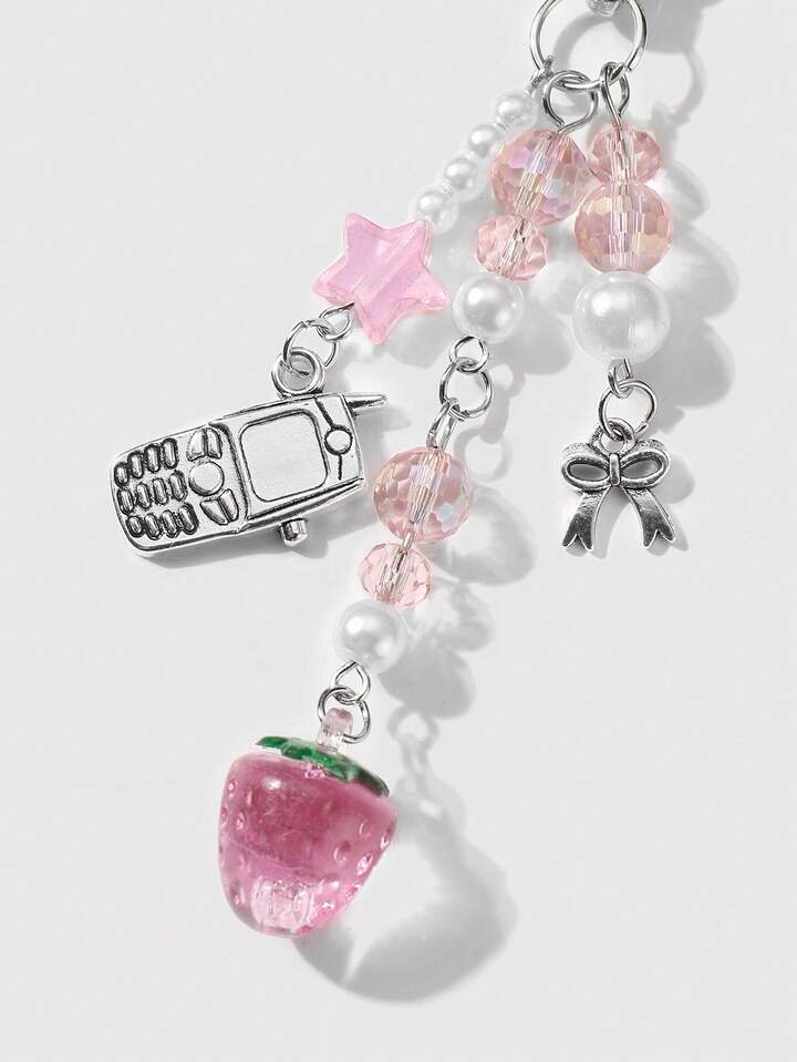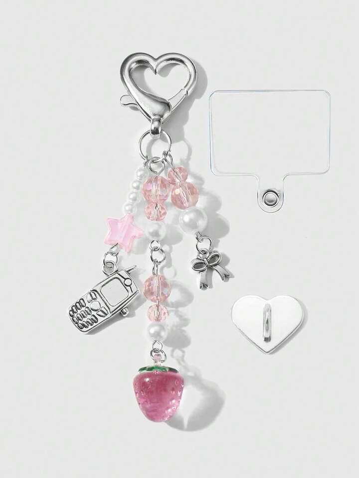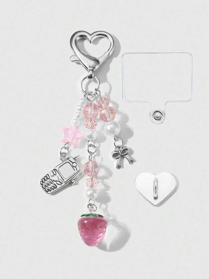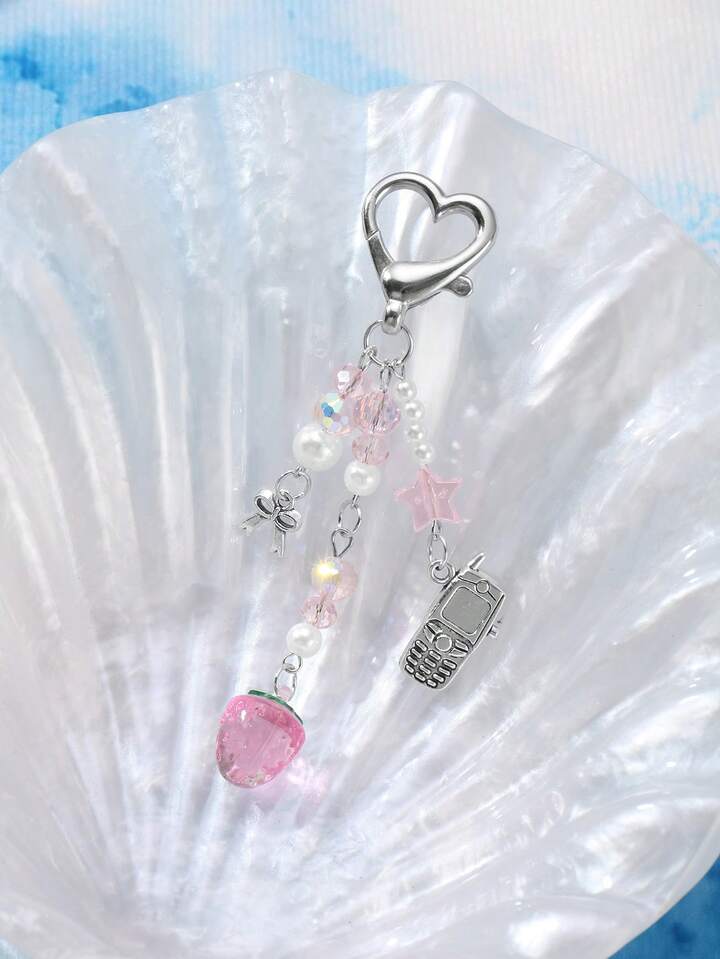 Kawaii 1pc Cute & Elegant Handmade Beaded Keychain With Pink Crystal, White Faux Pearl, Star, Bow, Strawberry Decor, Mini Phone Charm, Suitable For Women, Girls, Daily Wear, Holiday Gift, Comes With Phone Holder & Adhesive Heart Accessory