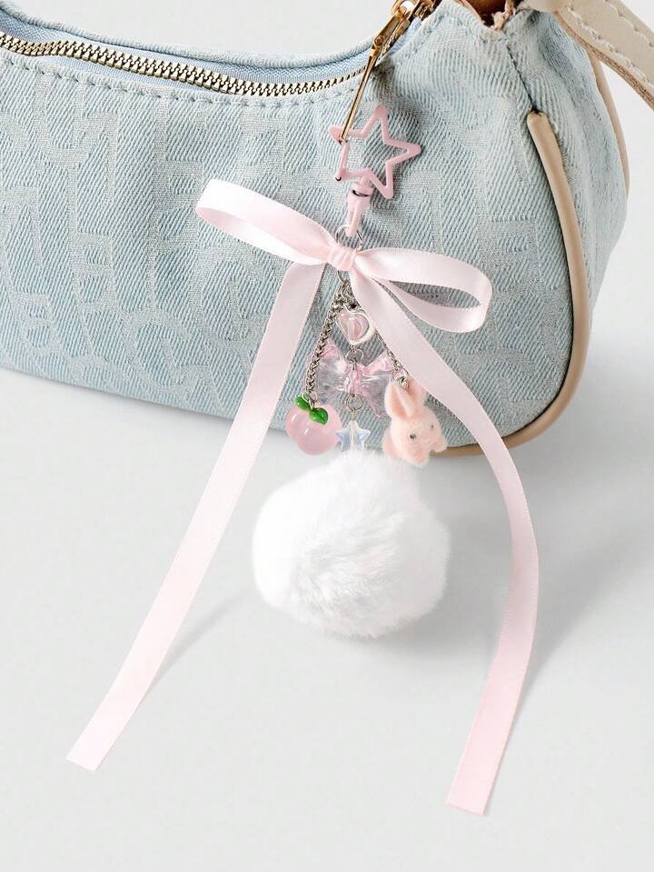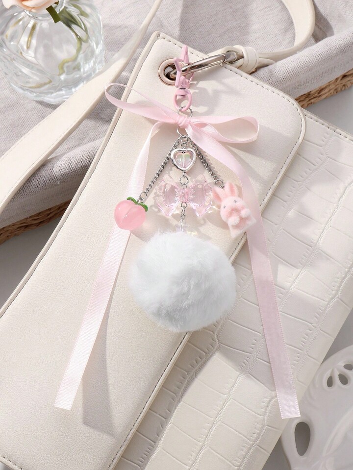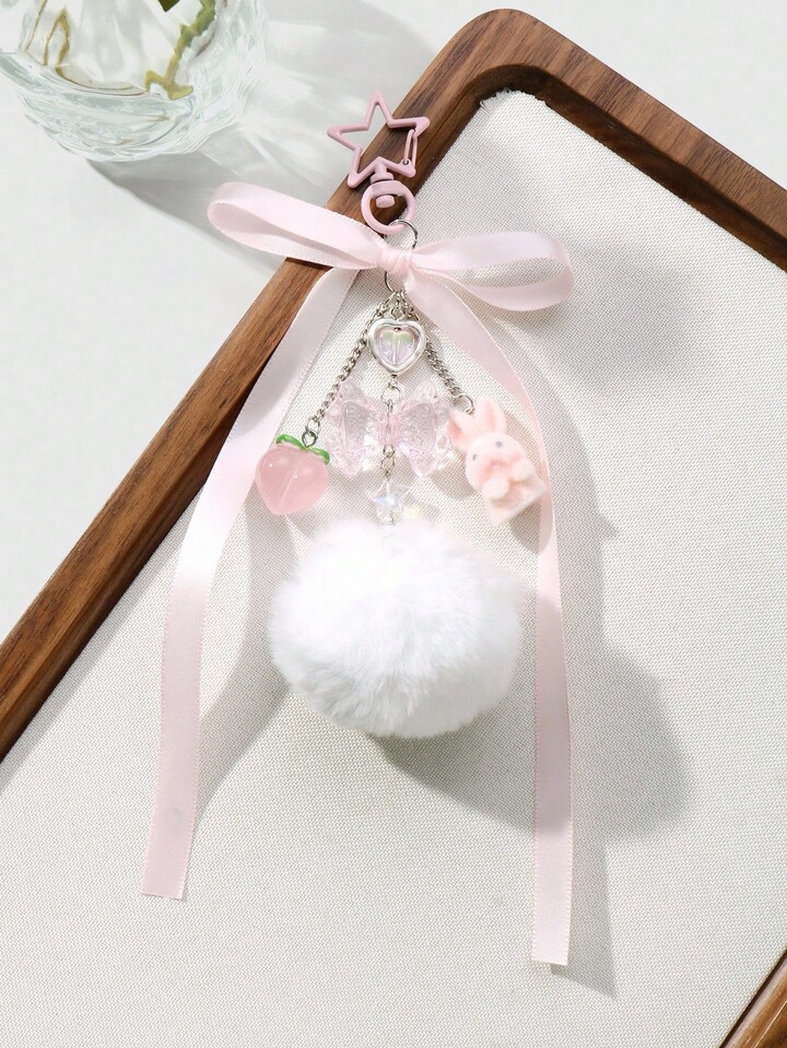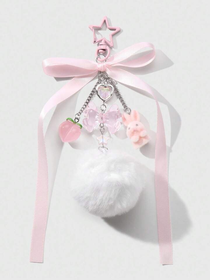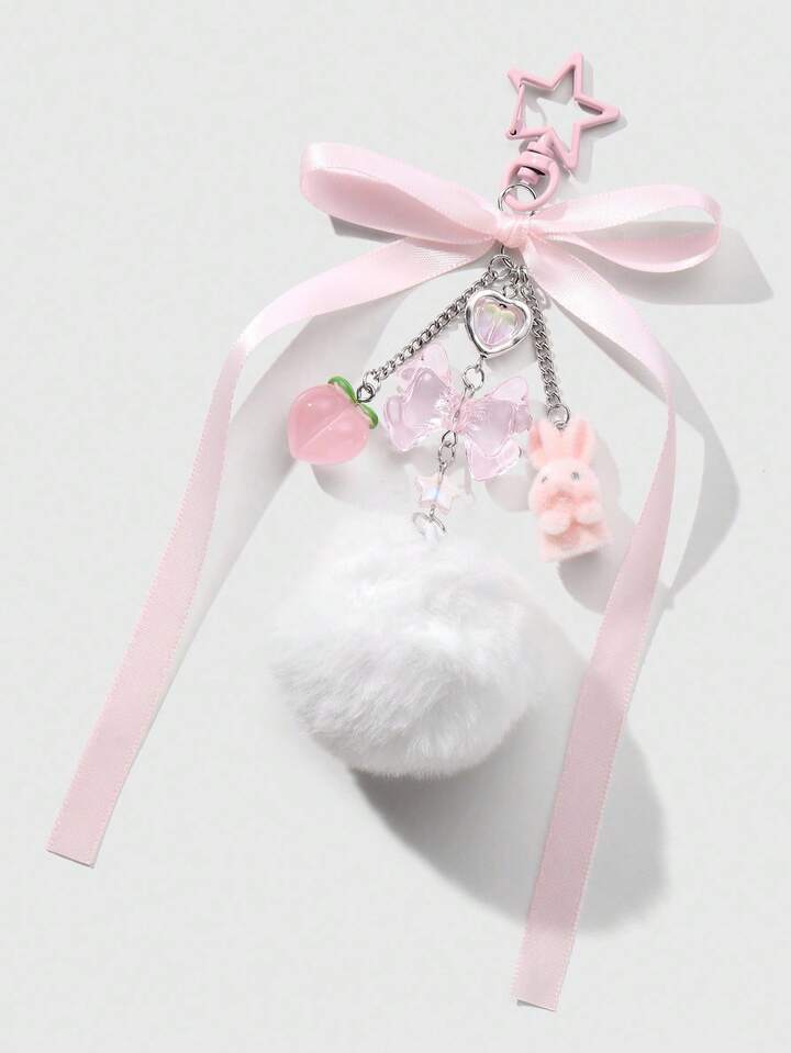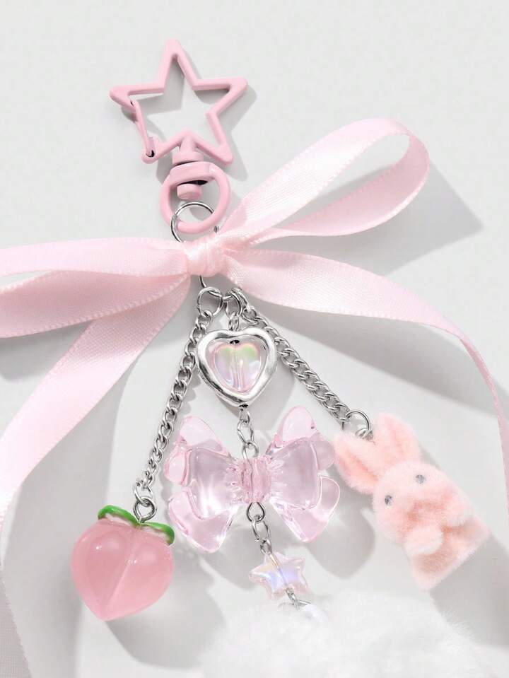 Kawaii 1pc Cute & Fashionable Resin Bow, Peach Flocked Rabbit, Star Pendant Keychain/Bag Charm, Versatile Accessory, Ideal Gift For Women