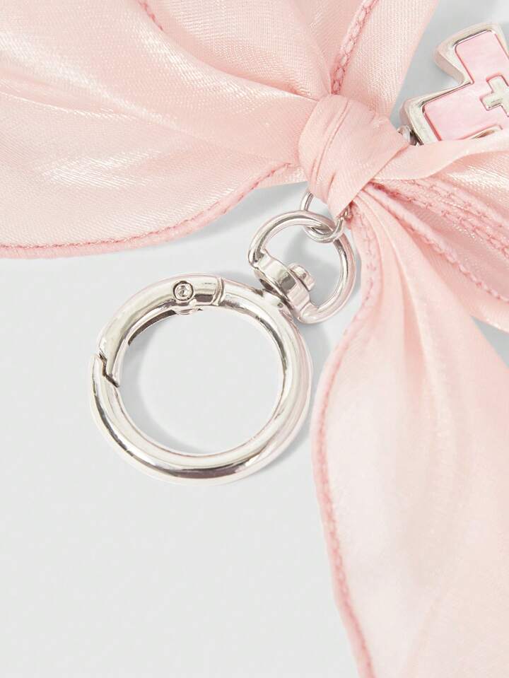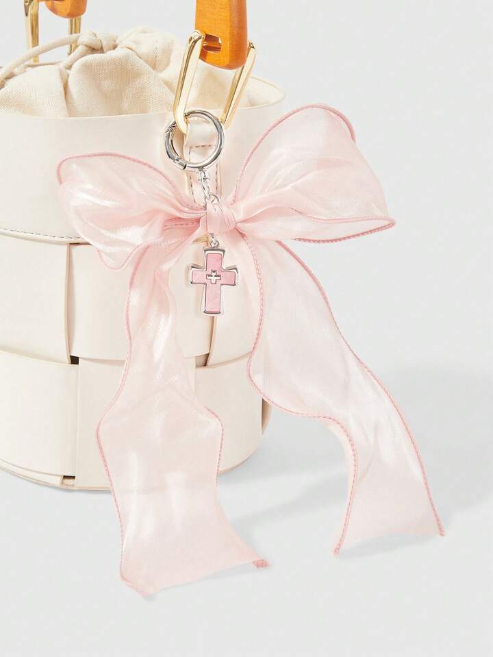 Kawaii 1pc Cute Schoolgirl Pink Bow Organza Bow Mother-Of-Pearl Cross Keychain Bag Charm