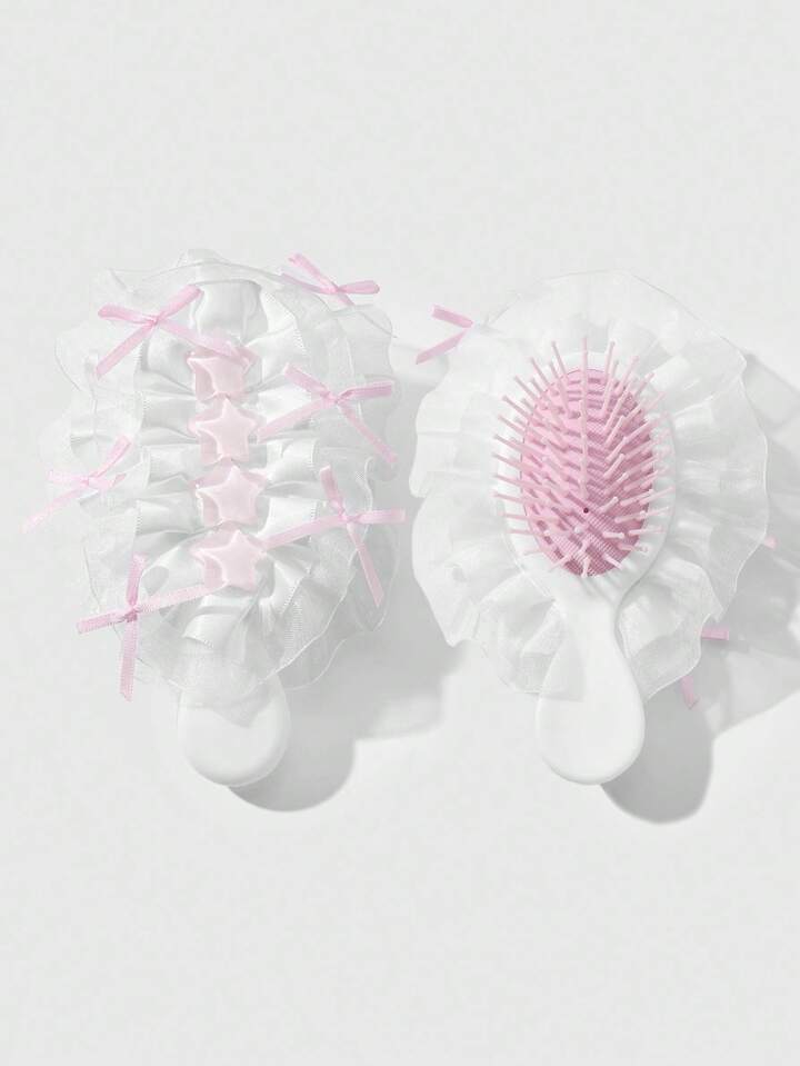 Kawaii 1pc Cute & Sweet Mini Cartoon High-Quality Pink & White Mesh Lace Ribbon Bow Resin Glitter Star Decor Mini Air Cushion Massage Hair Comb, Suitable For Women/Girls Daily Use, Holiday Gift