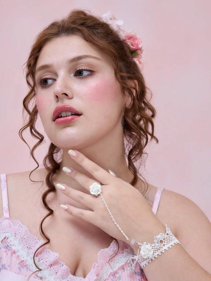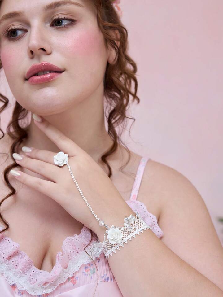Kawaii 1pc Elegant Rose Crystal Pendant Bracelet, High-Quality Rococo Geometric Lace Bracelet Ring Combination, Unique Design Fashion Adjustable Braided Handmade Rope