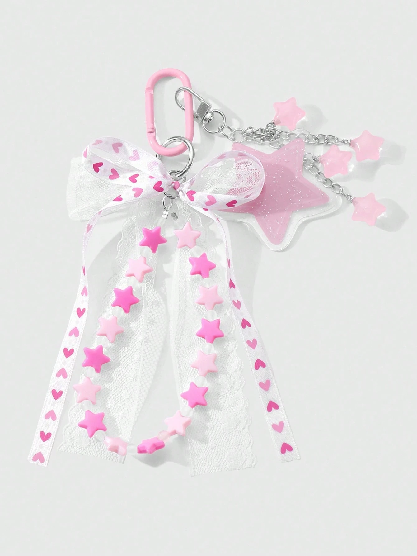 Kawaii 1pc Fashionable, High Quality, Sweet, Versatile Pink Acrylic Glitter Star, Crystal Heart, Ribbon, Net Lace Bow Design Keychain, Phone Charm, Bag Decoration Suitable For Women, Girls, Daily Use And Holiday Gifts