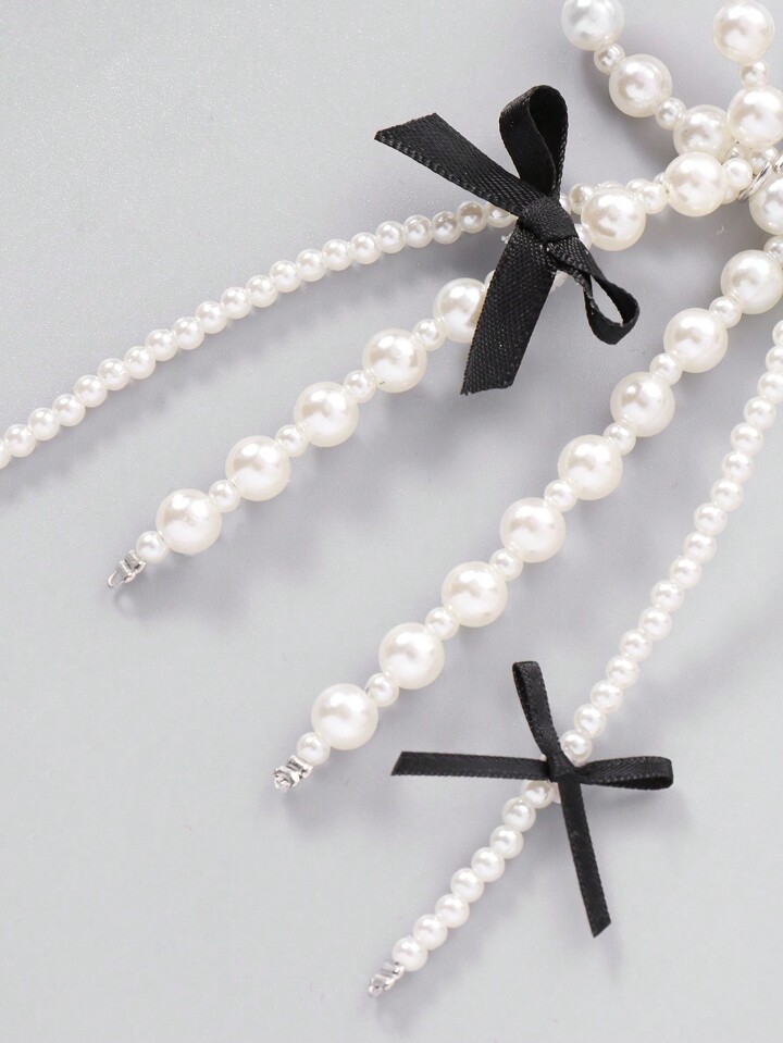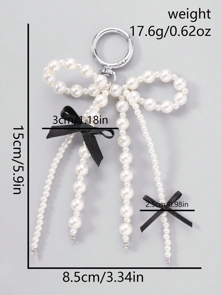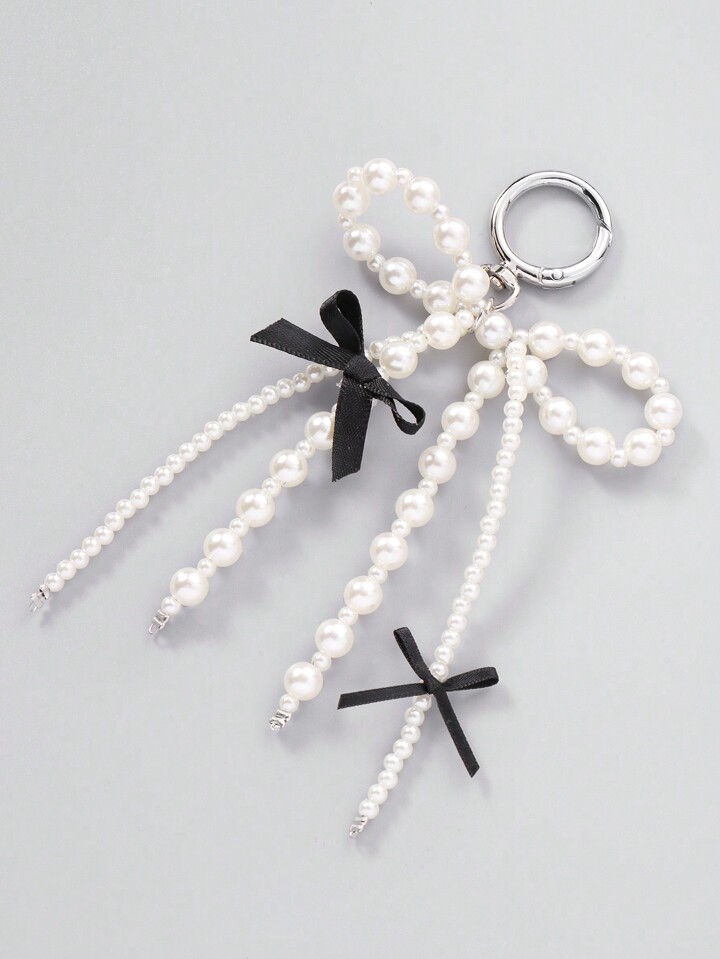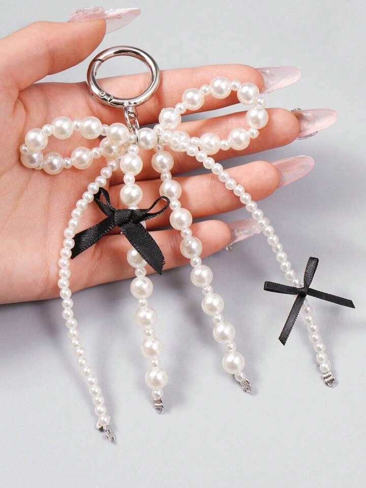 Kawaii 1pc Fashionable Minimalist Chic Luxury Style Handmade Pearl Beads Black Ribbon Bow Keychain & Key Ring Handbag Charm, Suitable For Daily Wear And Festival Gifts