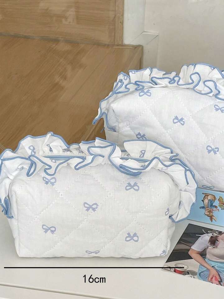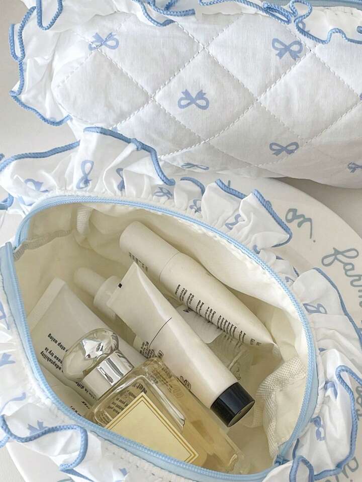 Kawaii 1pc Floral Bow Decor Makeup Bag,Portable Sweet & Fresh Ruffle Handbag,Highly Attractive Diamond Pattern Cosmetic Bag For Halloween And Christmas Festival