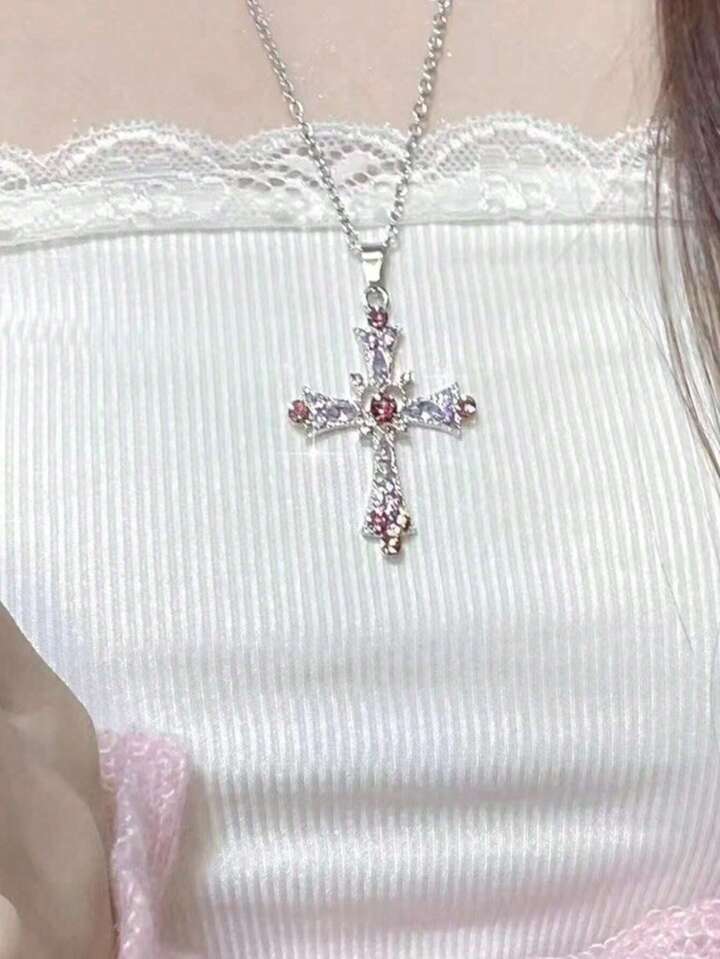 Kawaii 1pc Glamorous Zinc Alloy Rhinestone Decor Cross Pendant Necklace For Women For Dating Gift