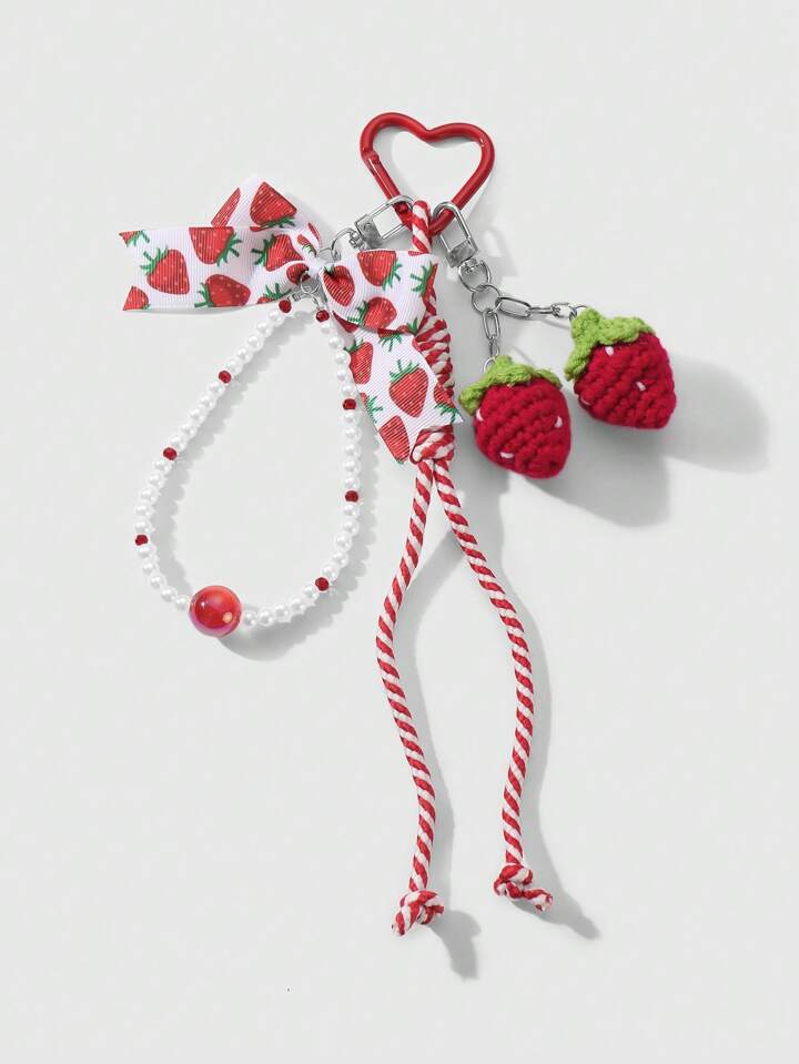 Kawaii 1pc Handmade Delicate & Sweet Versatile High-Quality Beaded White Faux Pearl, Red Cat Eye Pendant, Bowknot, Printed Ribbon, Fake Strawberry Braided Cord, DIY Lovely Keychain, Phone Charm, Bag Pendant, Suitable For Women/Girls Daily Use, Holiday Gift