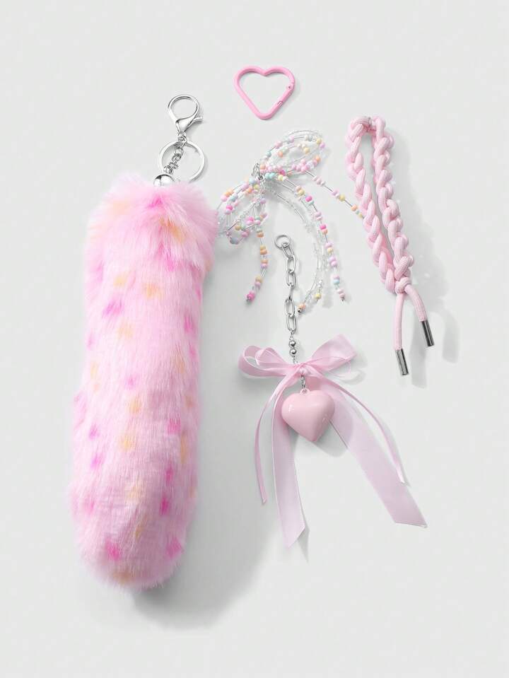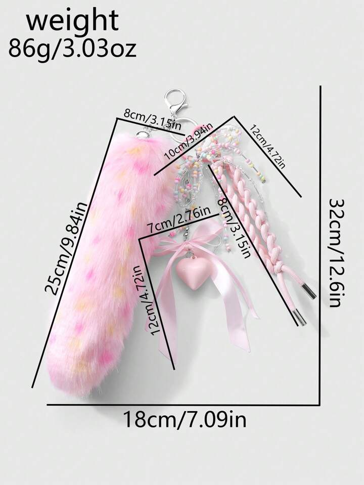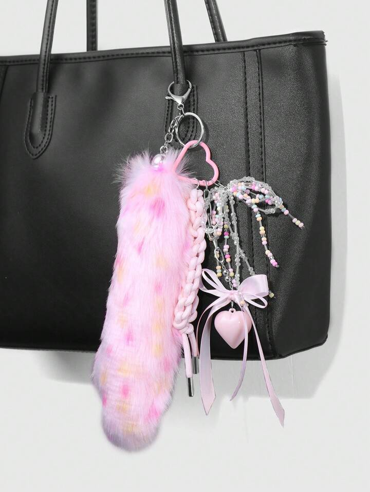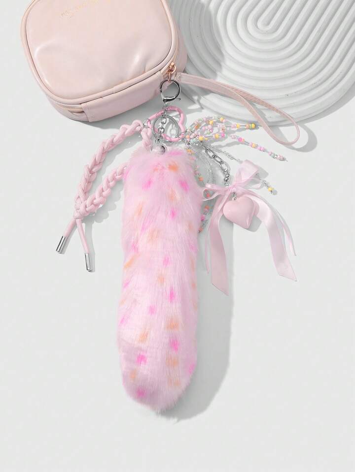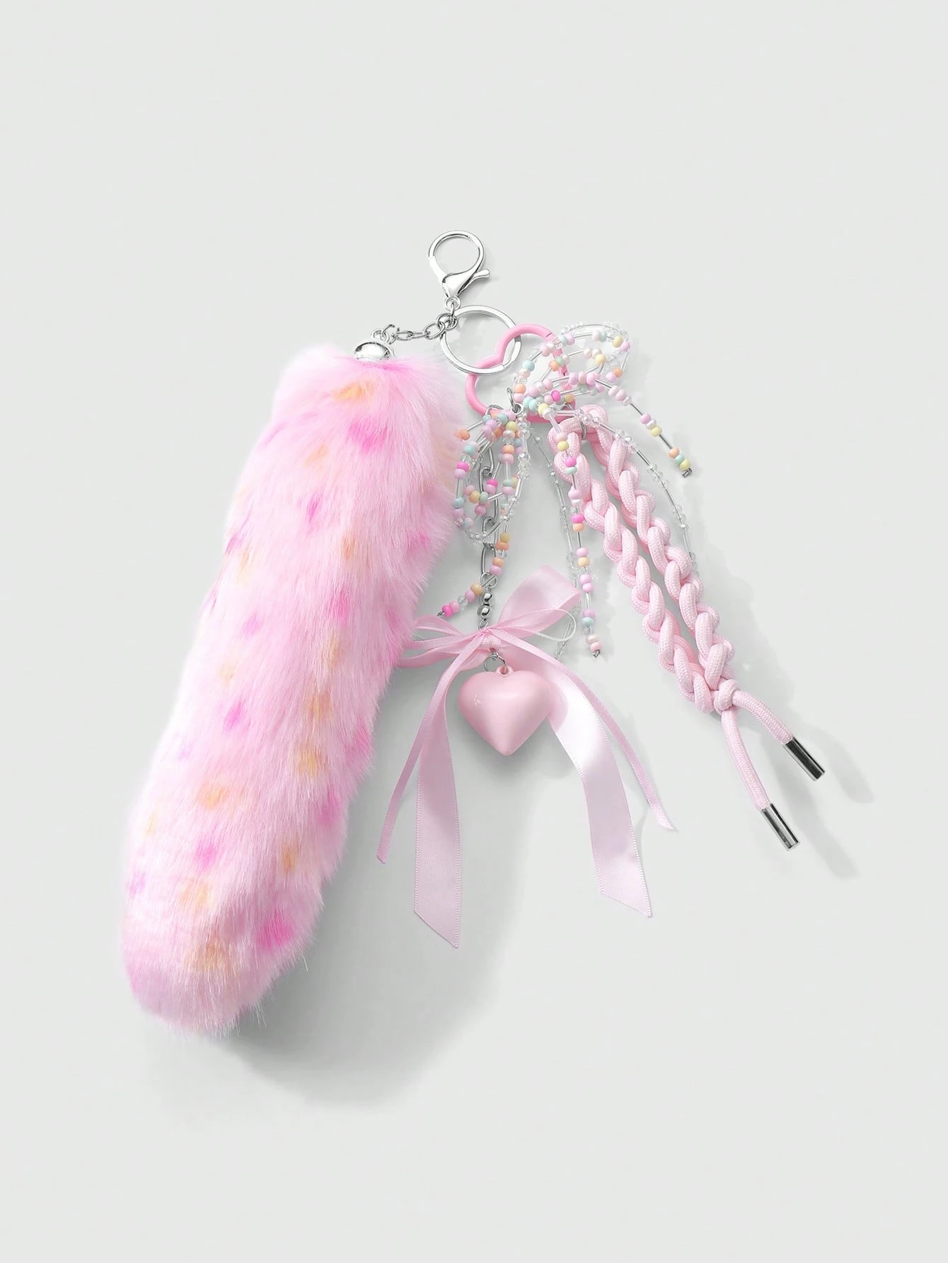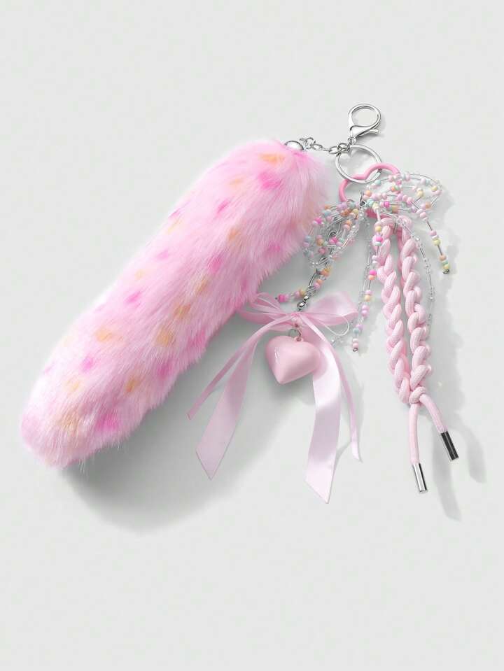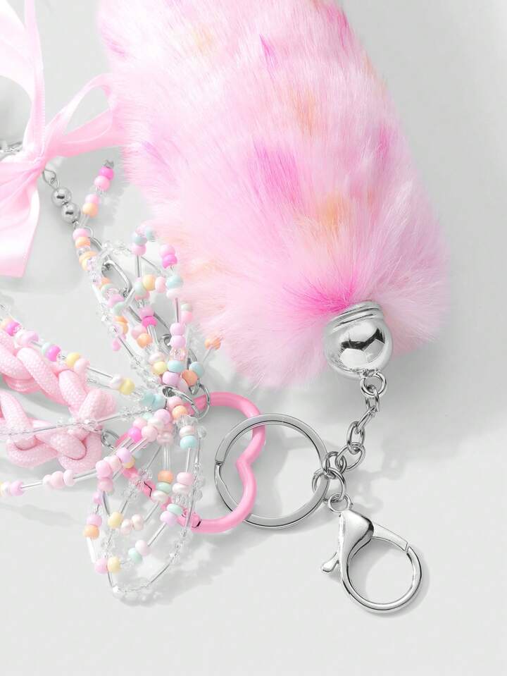 Kawaii 1pc Ins Style Cute Girl Korean Aesthetic High-End Pink Faux Fur Dot Animal Tail Handmade Beaded White Faux Crystal Colorful Rice Bead Ribbon Bow Acrylic Heart Mountaineering Rope Keychain Backpack Pendant, Suitable For Women And Girls, Daily Wear, Holiday Gift