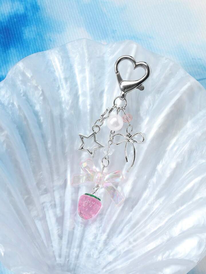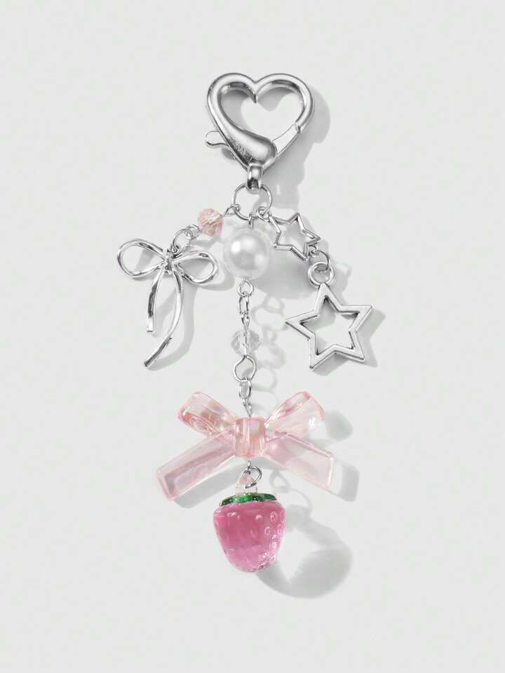 Kawaii 1pc Ins Style Delicate Minimalist Hollow Star Bow Faux Pearl Strawberry Resin Pendant Keychain, Versatile For Girls Ladies Everyday Wear, Ideal Gift