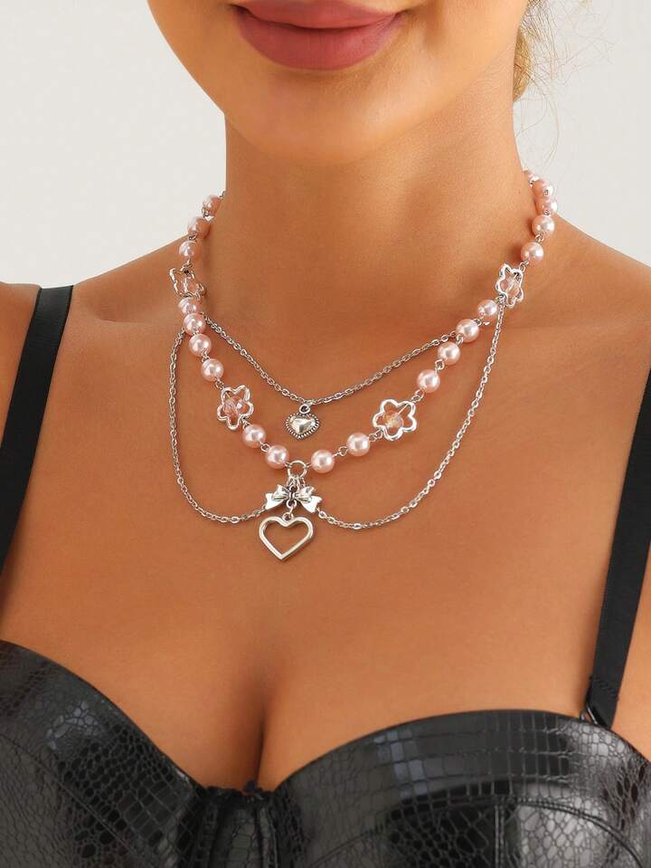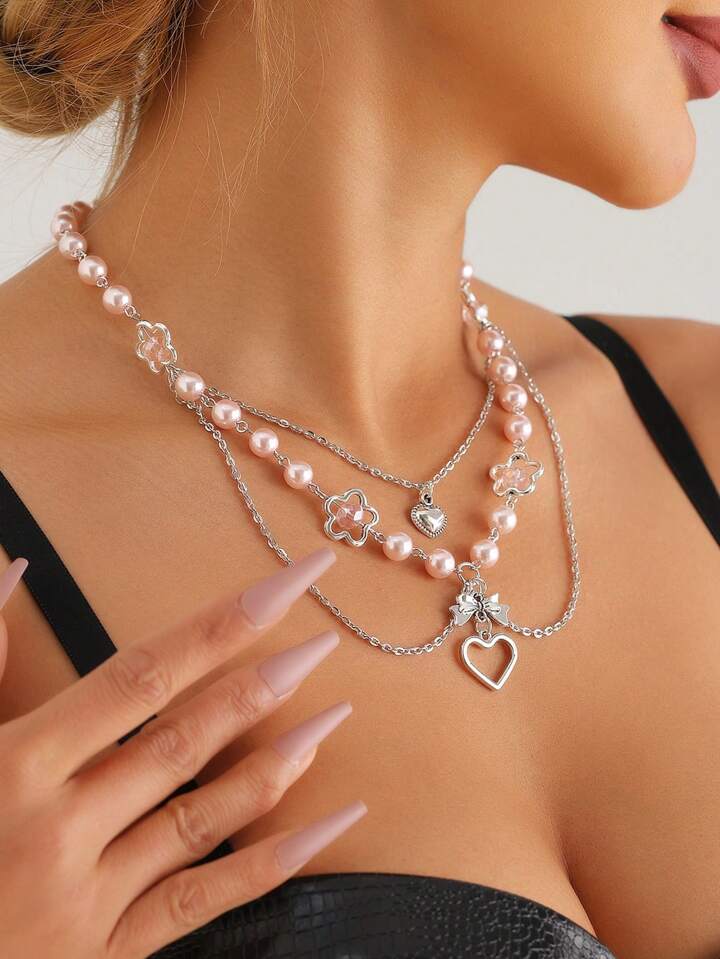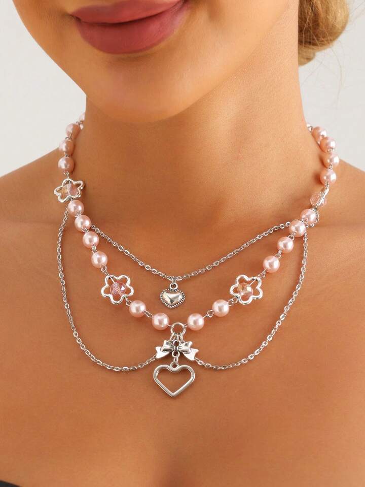 Kawaii 1pc Lady Pink Faux Pearl Heart Multilayer Necklace Valentines,Mom,Mother,Mother's Day,Gift
