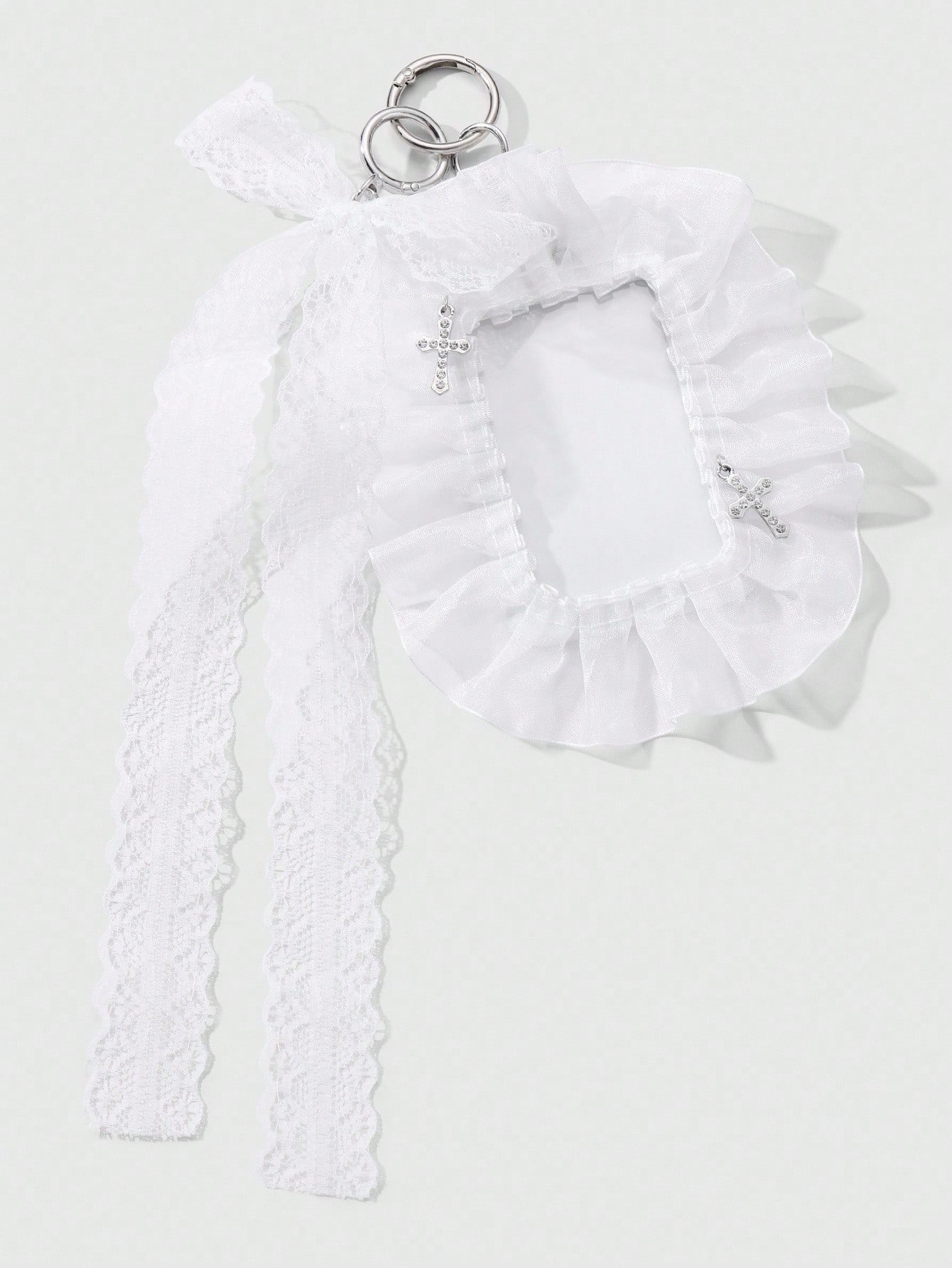 Kawaii 1pc Minimalist Versatile Elegant Lace Bow Mesh Rhinestone Cross Decor Card Holder, Suitable For Office Workers, Students, Daily Wear, Holiday Gift