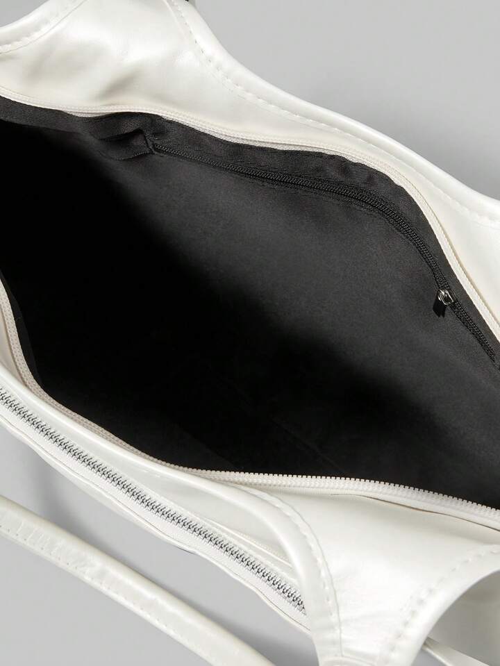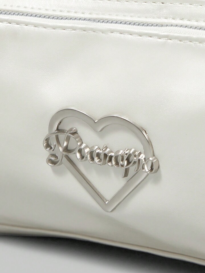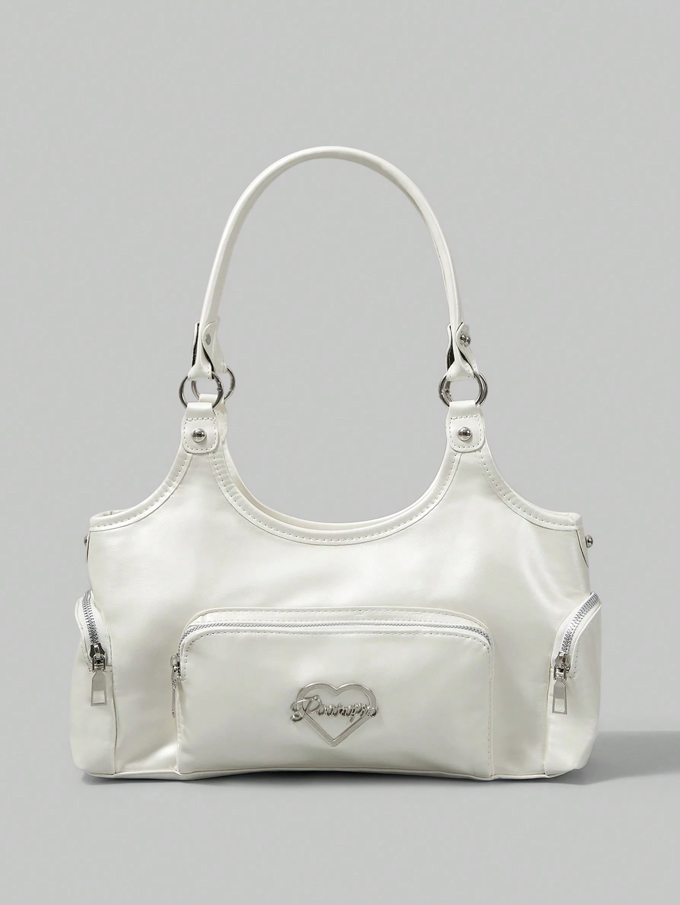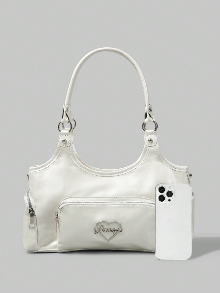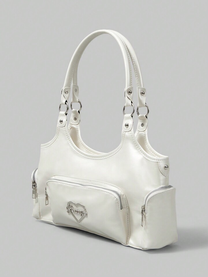 Kawaii 1pc Pearlescent White Tote Bag With Metal Heart Decor, Dual Side Pockets, Large Capacity, Suitable For Daily Wear
