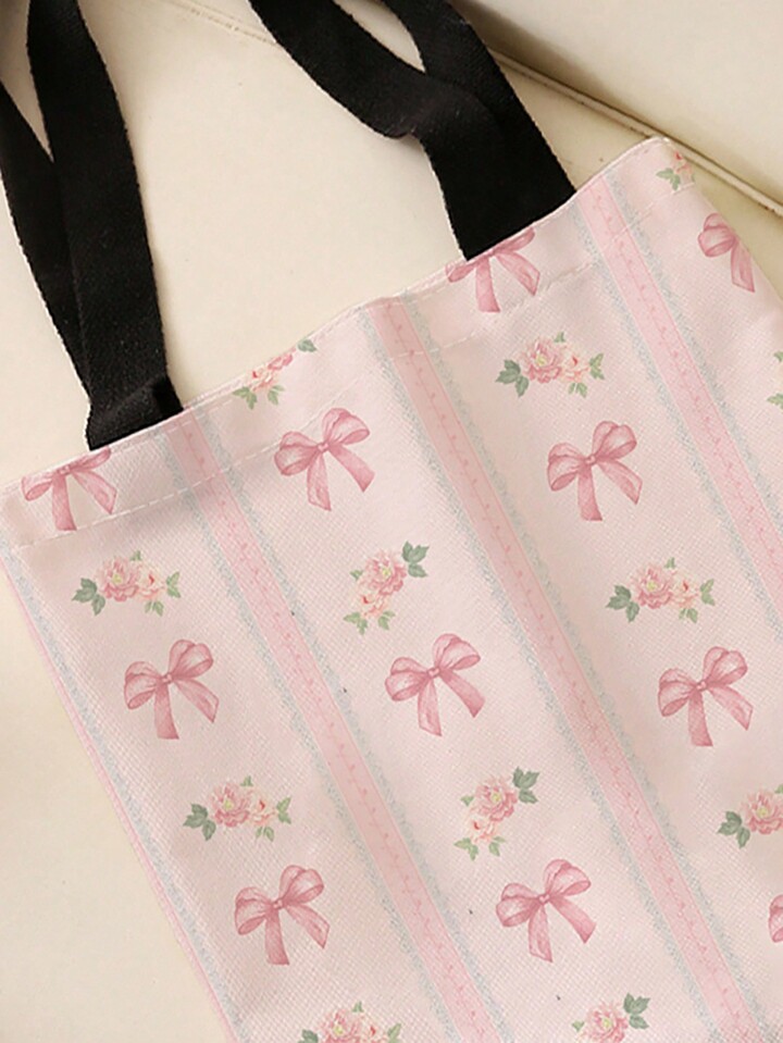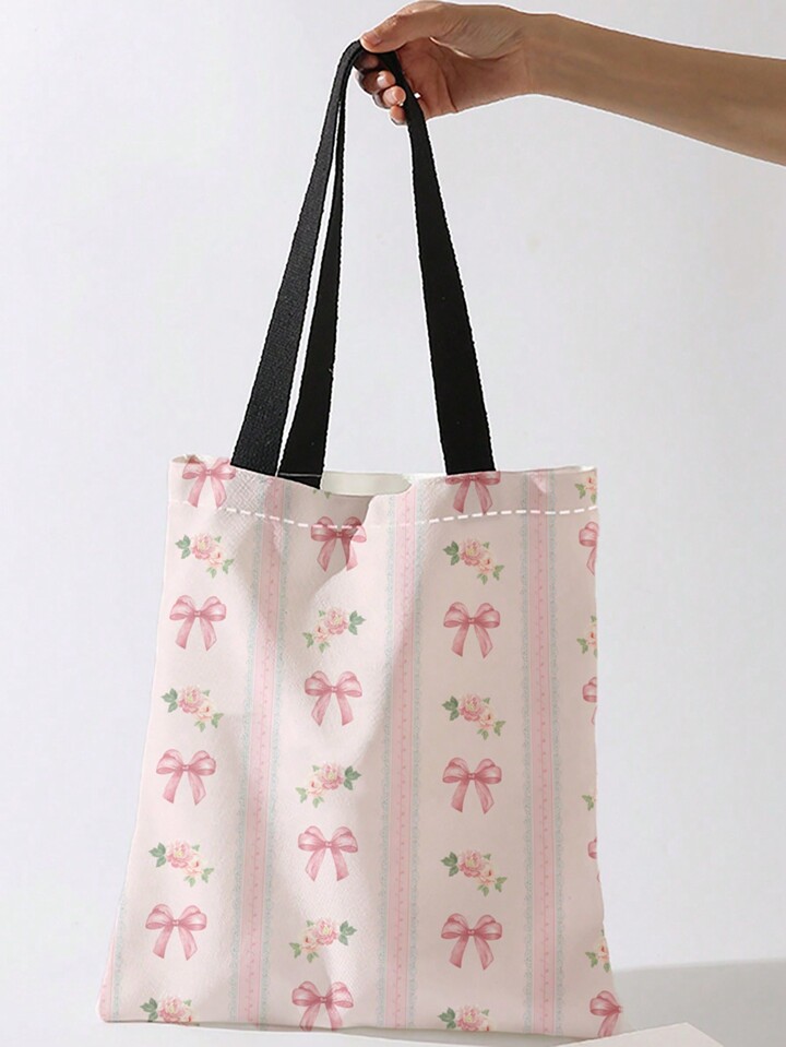 Kawaii 1pc Pink Bow Print Cute Tote Bag, Fashion Commute Canvas Handbag, Shopping Bag, Student Book Bag