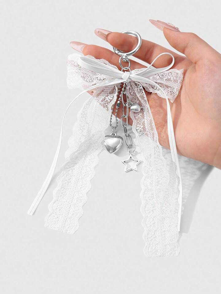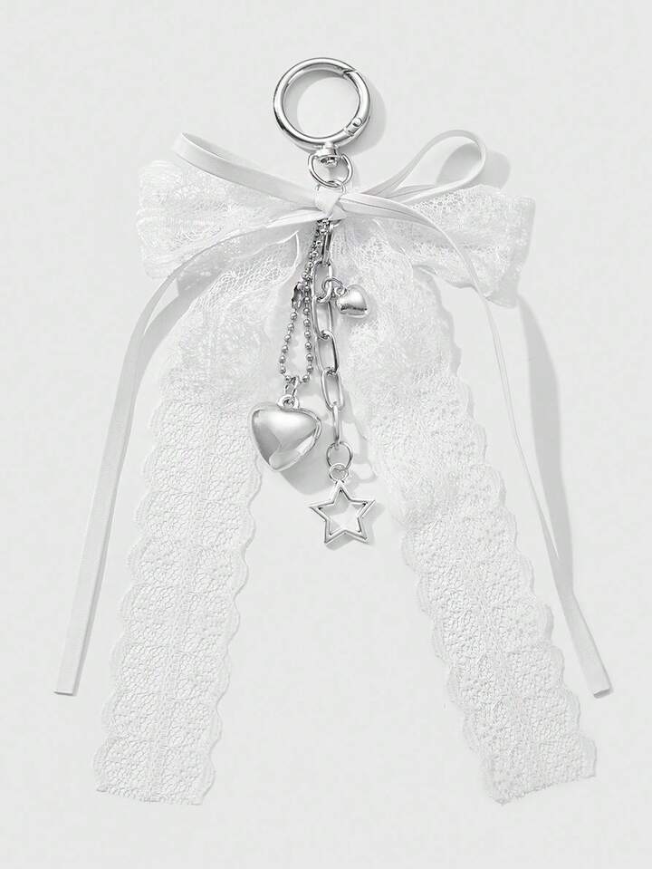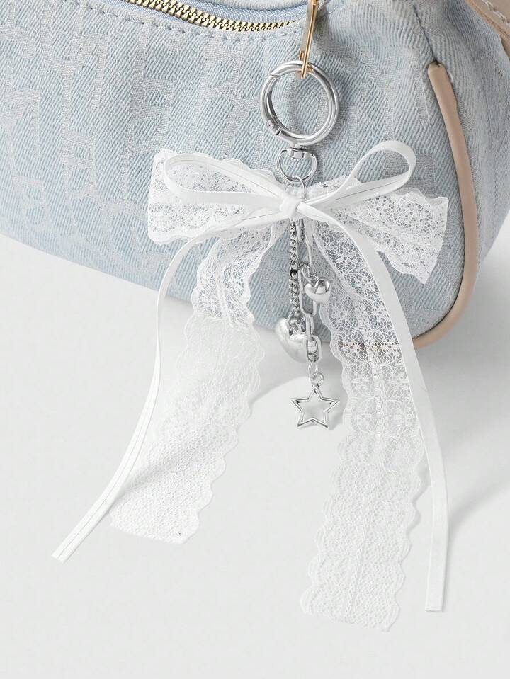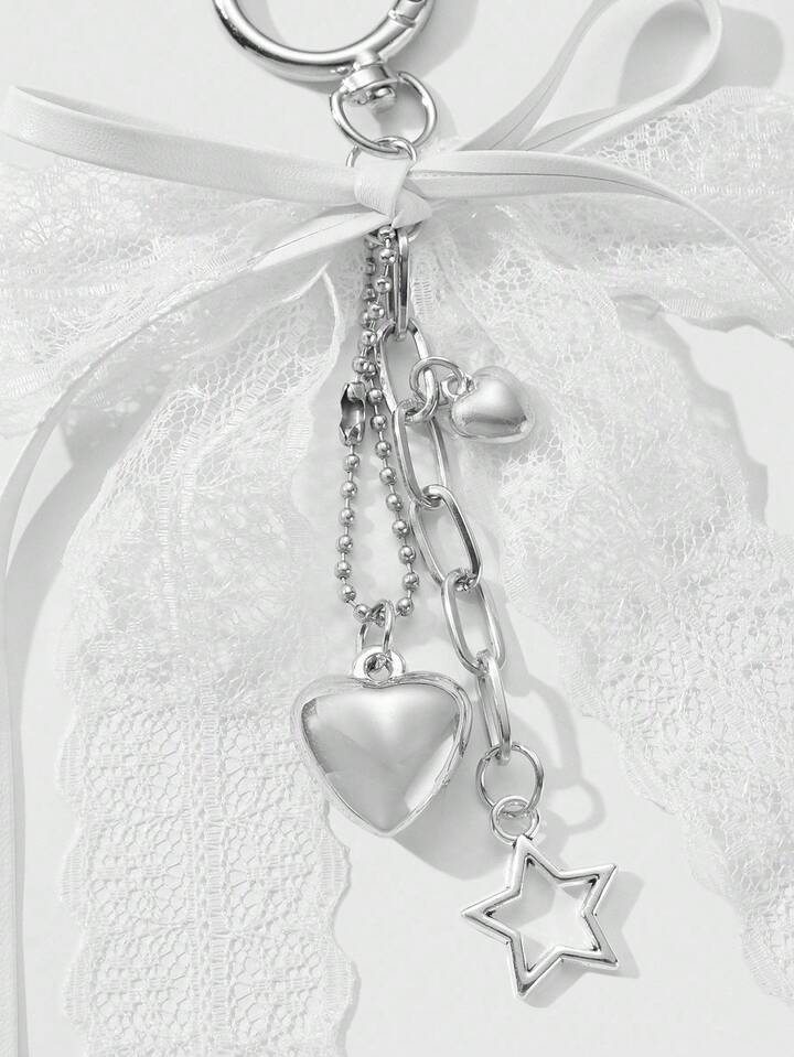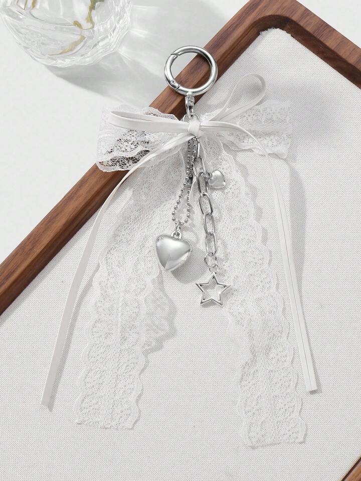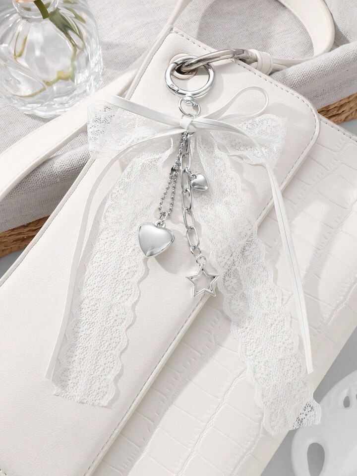 Kawaii 1pc Style Minimalist Elegant Versatile White Leather Lace Bow Silver Chain Star CCB Heart DIY Keychain Bag Charm, Suitable For Women, Daily Wear, Holiday Gift