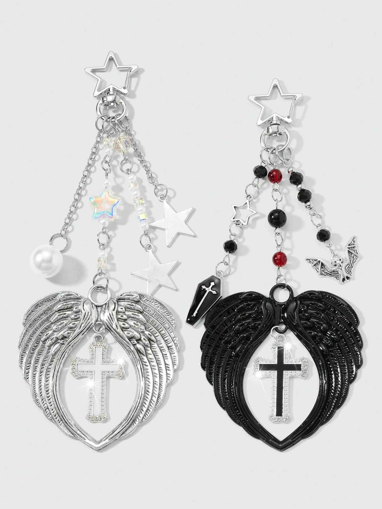 Kawaii 1pc Y2K Vintage Punk Goth Style Black/Silver Chain Faux Pearl Faux Crystal Star Vampire Bat Drip Oil Coffin Cross Devil Angel Wing Hollow Heart Crystal Cross DIY Keychain Bag Charm, Suitable For Couples, Best Friends, Women, Daily Wear, Holiday Gift