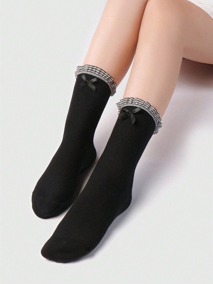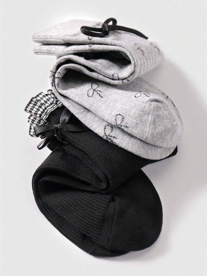 Kawaii 2 Pairs Vintage Style Elegant Simple Versatile College Ribbed Bow + Embroidered Bow Crew Socks Combo Pack, Suitable For Women Daily Outfit, Comes In Gift Box Packaging