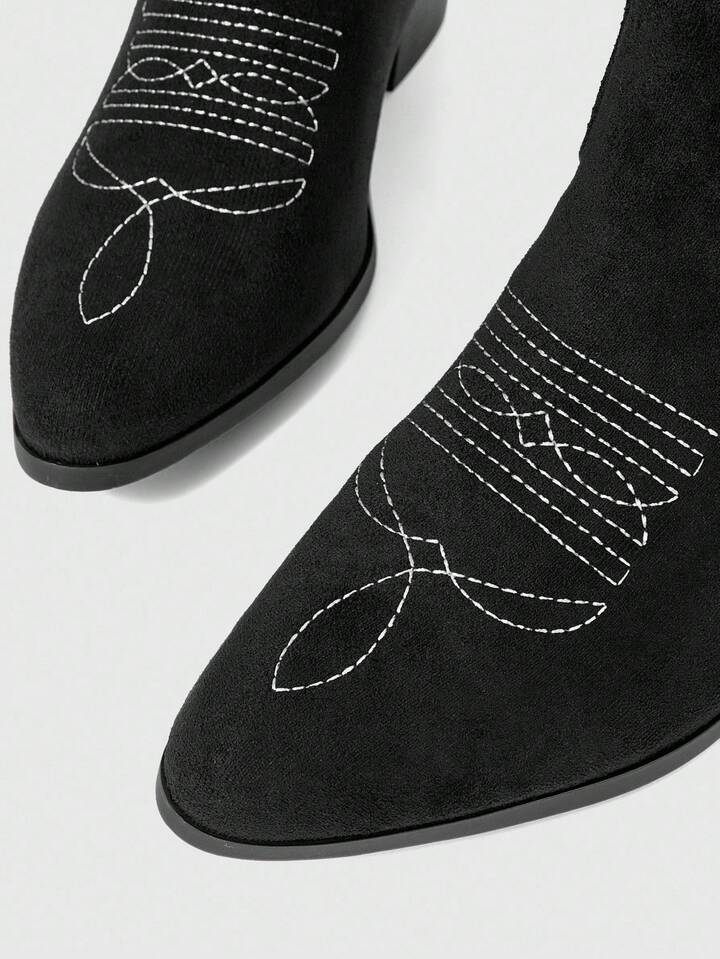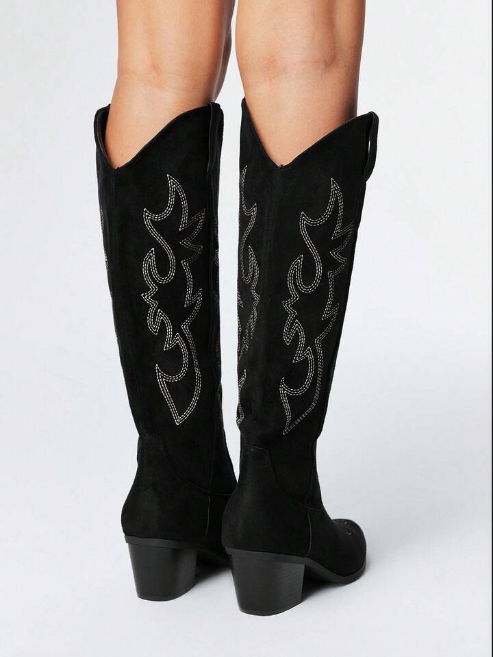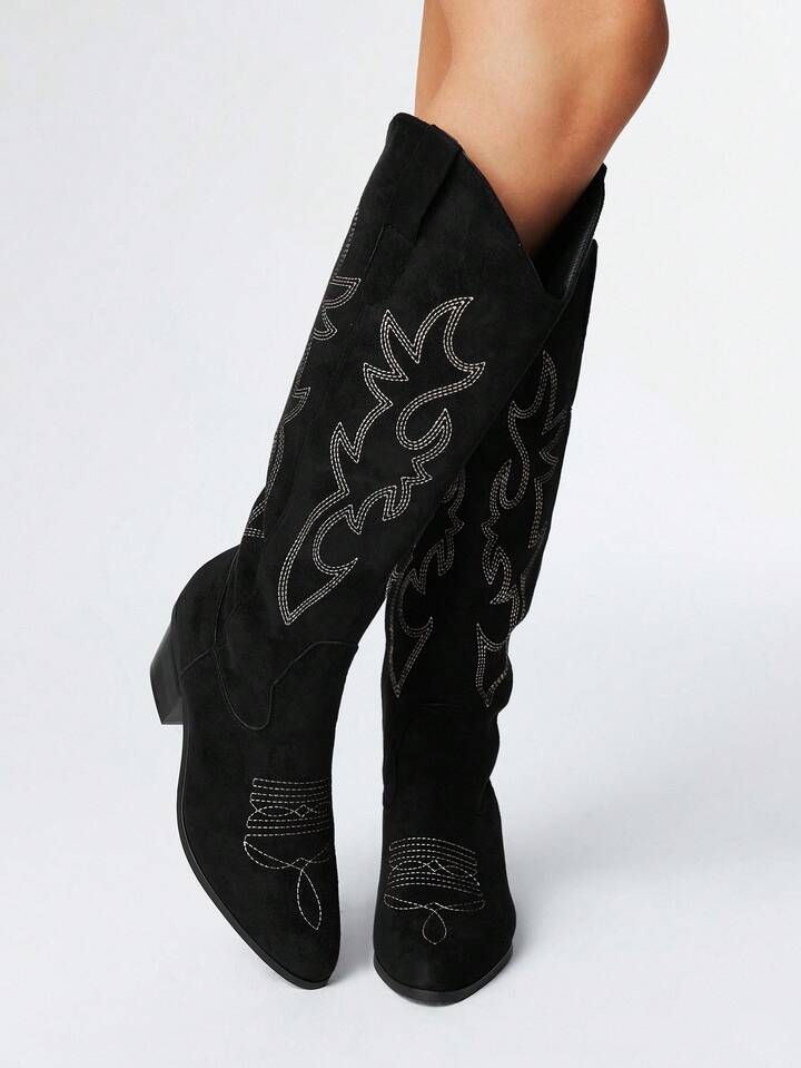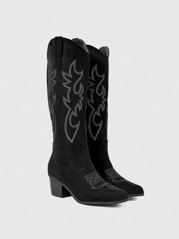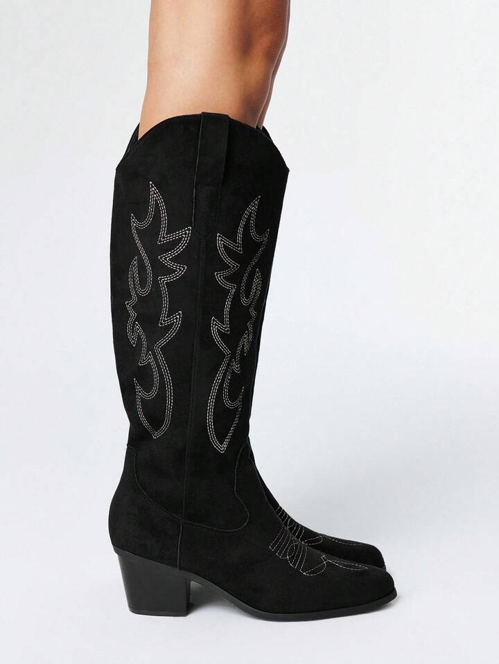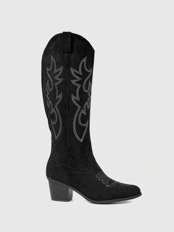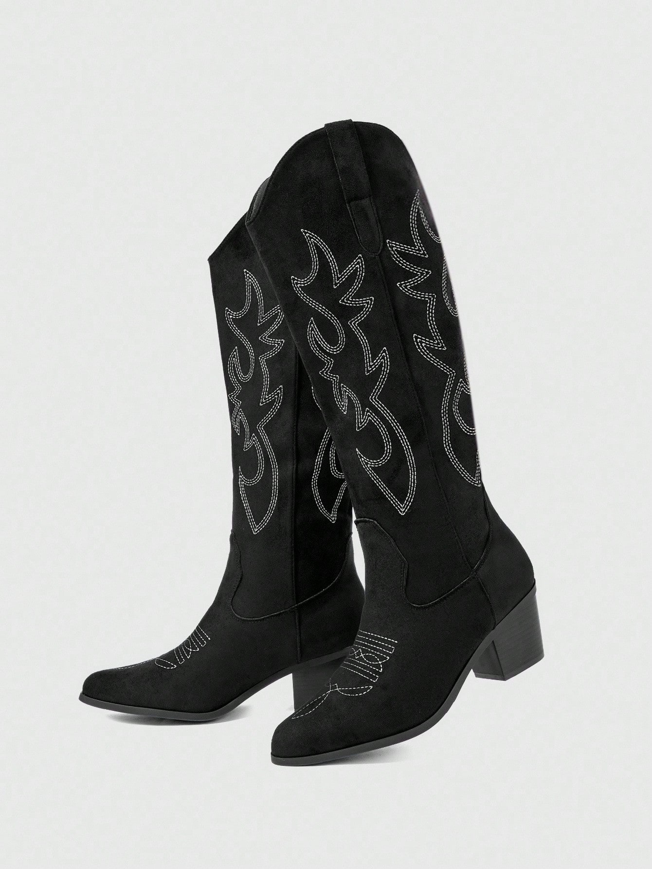 Kawaii 2025 Autumn/Winter New Women's Plus Size Fashionable Tall Embroidered Western Cowboy Boots, Suede Outdoor Pull-On Over-The-Knee Boots