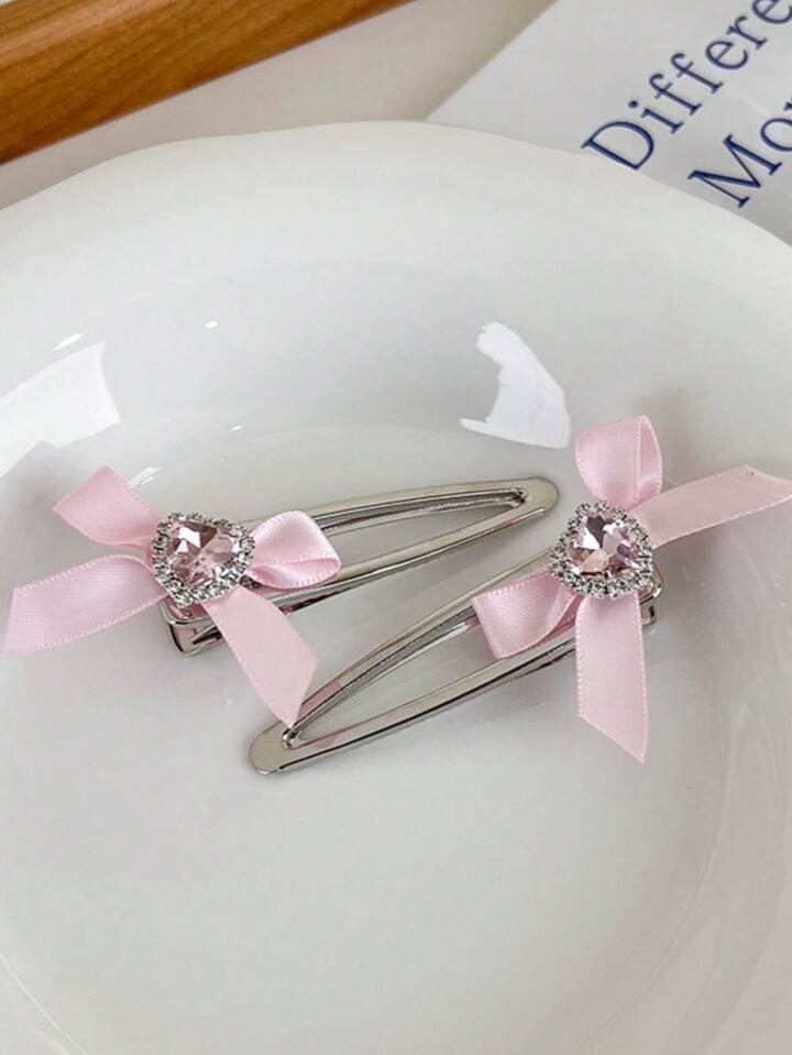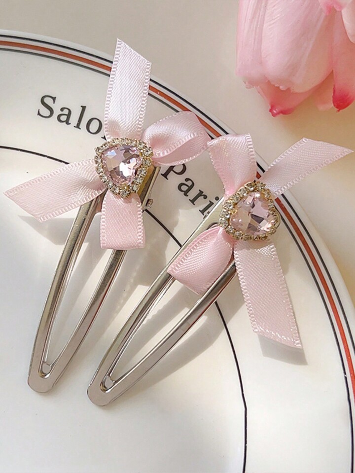 Kawaii 2pcs Cute Pink Ribbon Bow & Heart & Rhinestone Hair Clips Royal Valentines Claw Clips Hair Claws Hair Barrettes