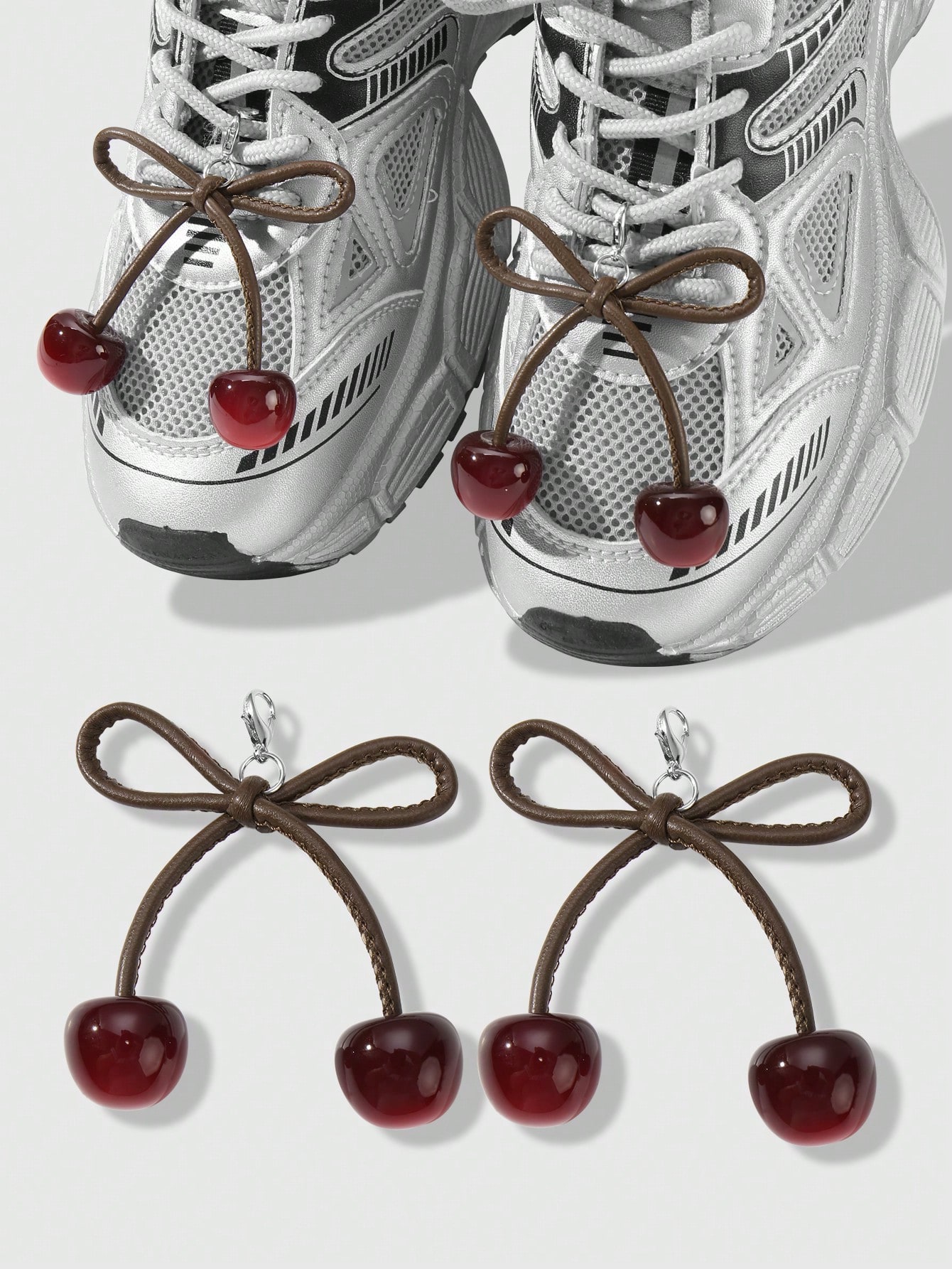Kawaii 2pcs/Set Cute Sweet Bowknot Resin Cherry Pendants, Versatile Simple Elegant Brown Leather Rope Charms For DIY Shoes Decorations, Suitable For Women Girls Daily Wear, Holiday Gift