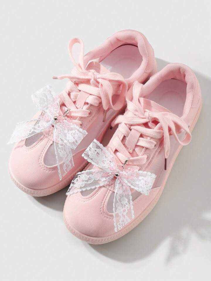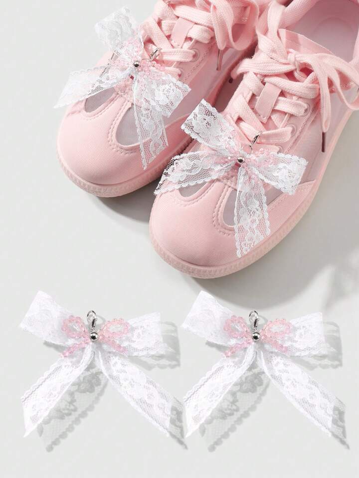 Kawaii 2pcs/Set Elegant Handmade Beaded Pink Crystal-Like & White Lace Bow Shoe Clips, Fashionable Korean Style Versatile Decoration Suitable For Women, Great As Daily Wear Or Gift