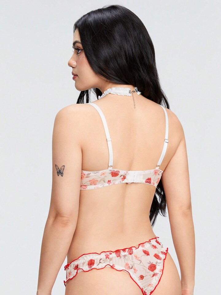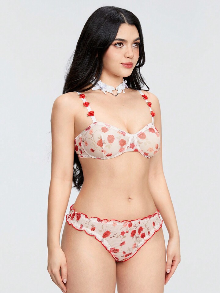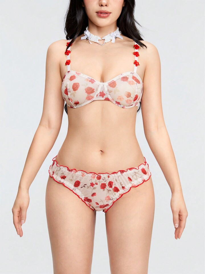 Kawaii 2pcs/Set Sexy See-Through Rose Decorated Floral Print Underwear Set