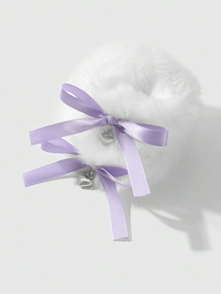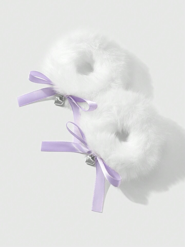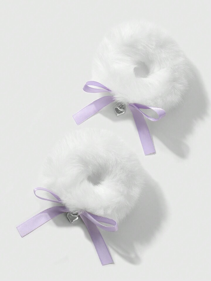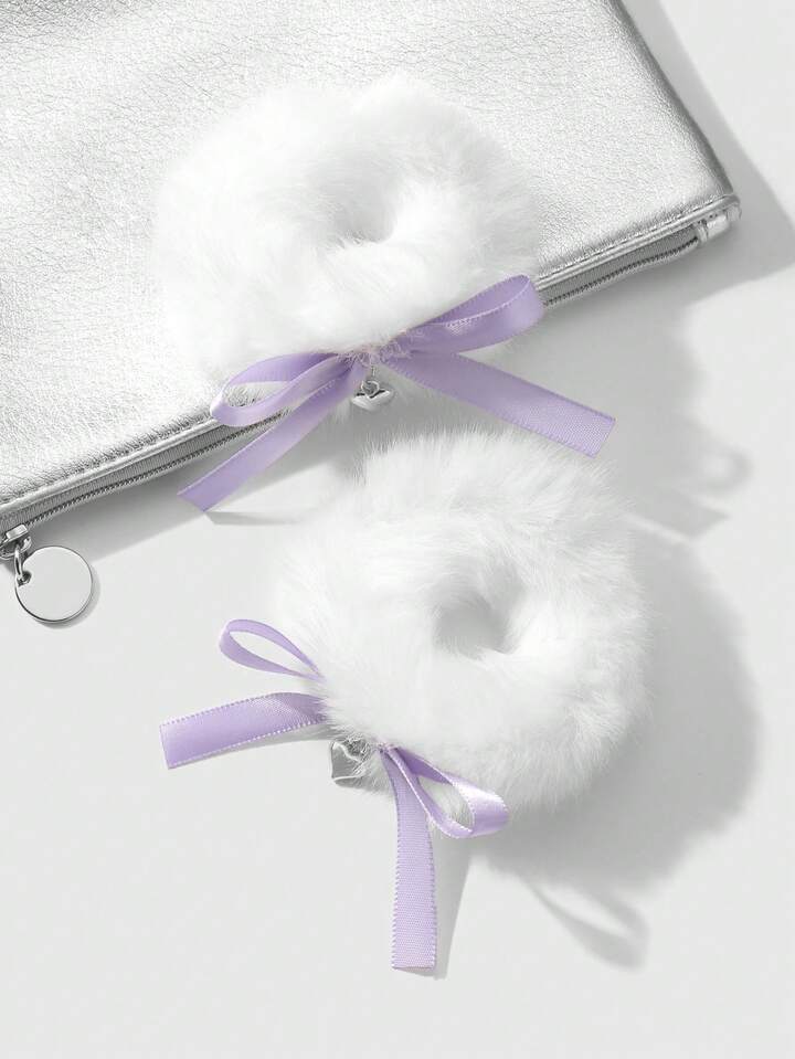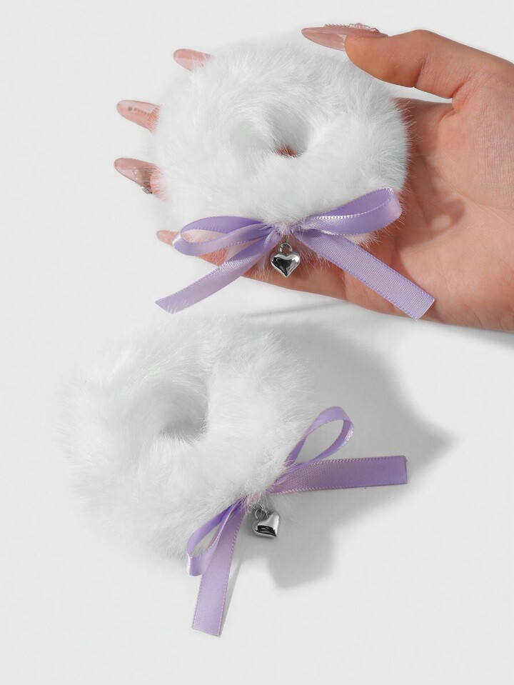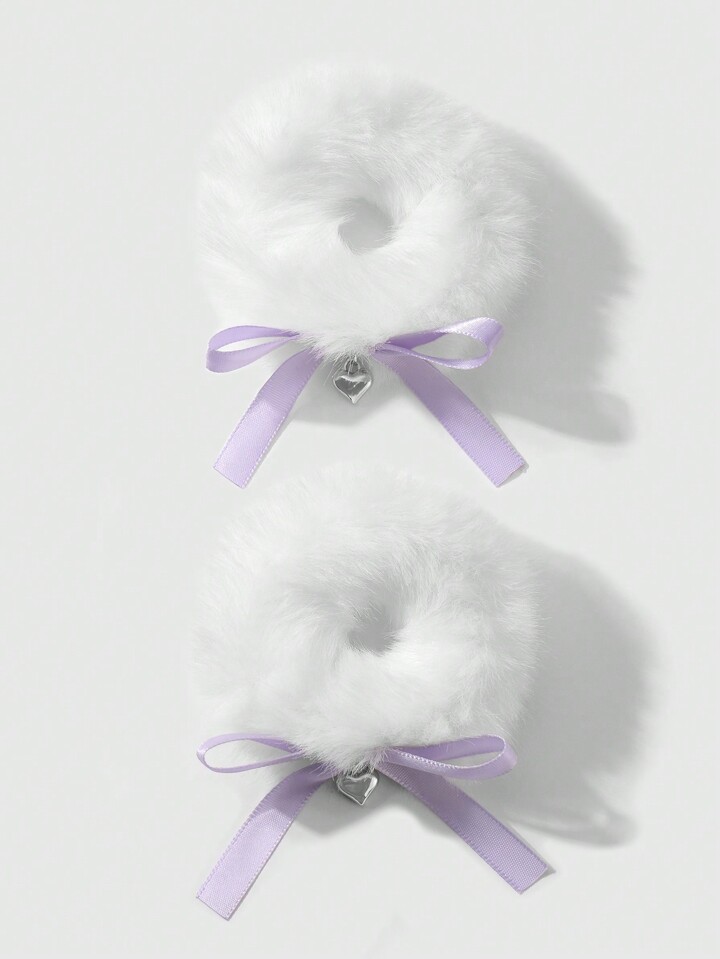 Kawaii 2pcs Set Sweet And Versatile High-Quality Cute White Plush Hair Scrunchies With Purple Woven Bow, And CCB Heart Pendant Decoration, Suitable For Girls And Women, Daily Wear And Gifts