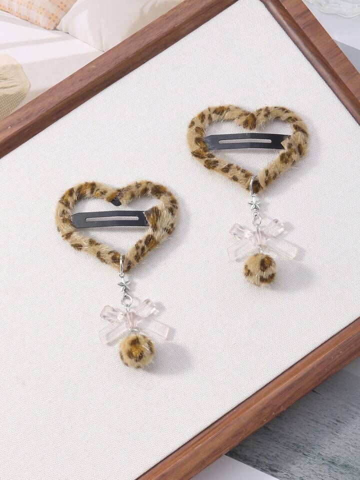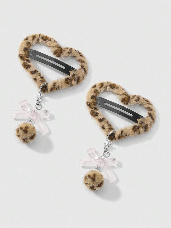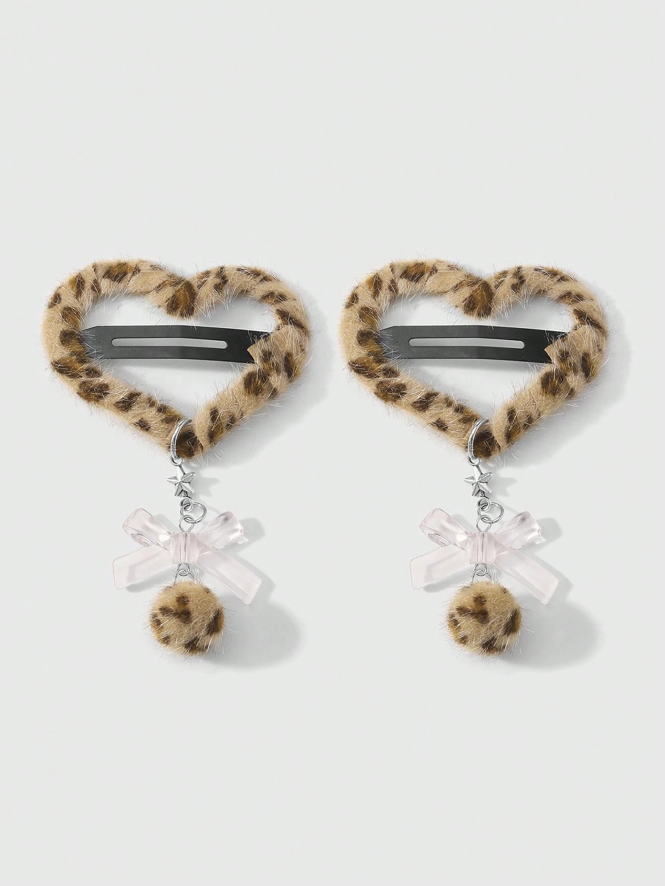 Kawaii 2pcs Y2K Retro Cute Stylish Collegiate Furry Ball, Star Chain, Leopard Print, Heart Shaped Hair Clips, Bangs Clips, Suitable For Women, Daily Wear, Holiday Gift Valentines Claw Clips Hair Claws Hair Barrettes