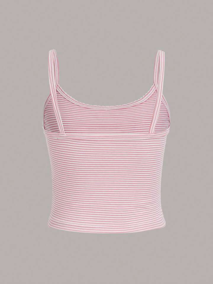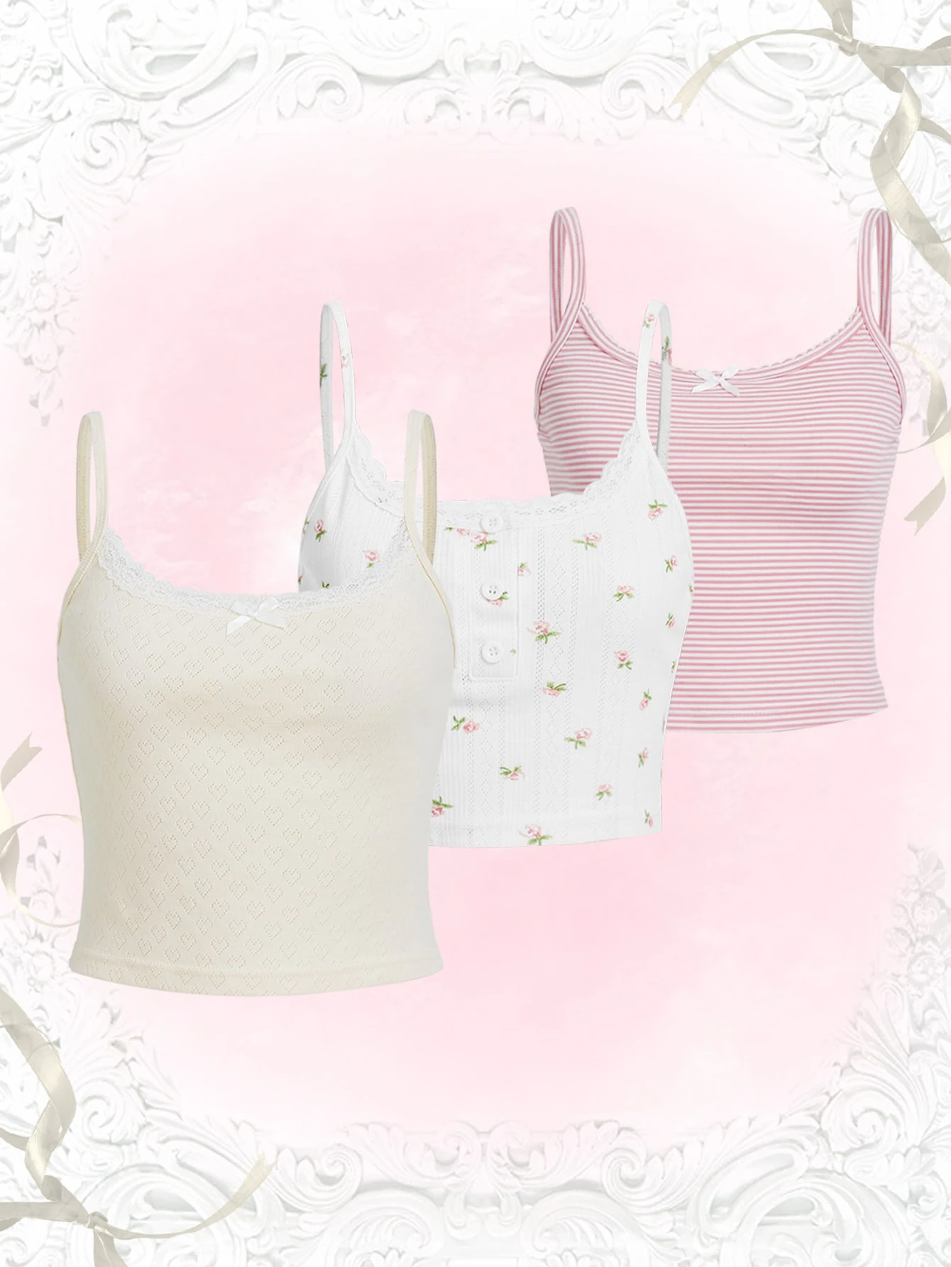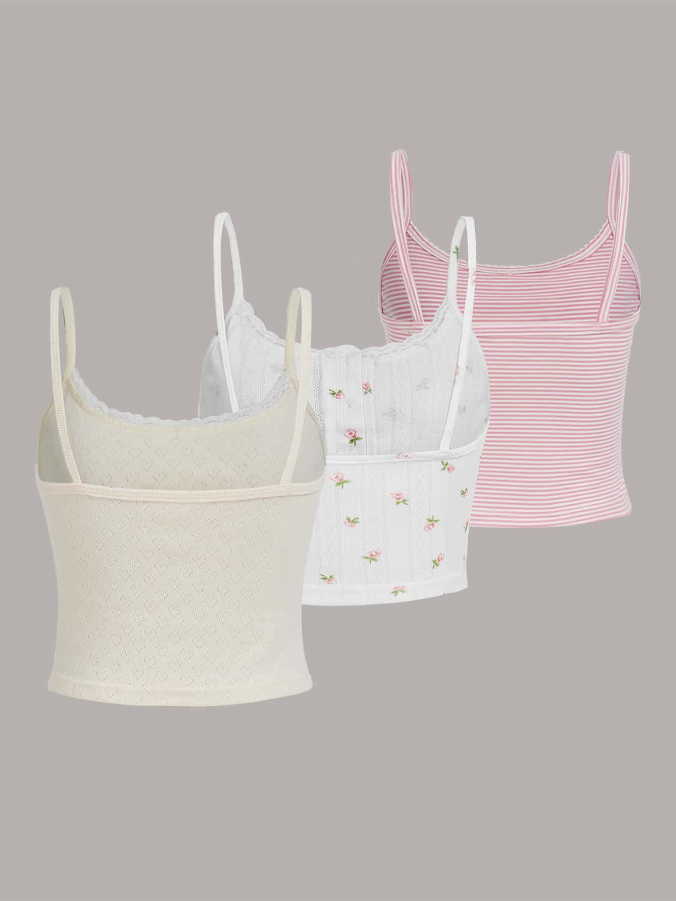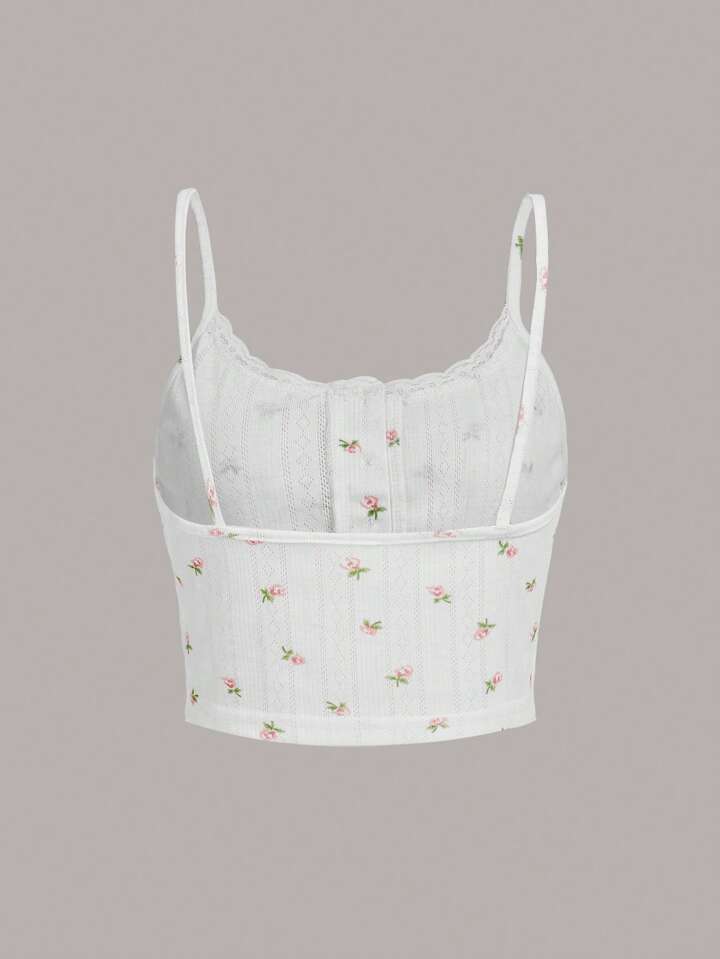 Kawaii 3pcs Ditsy Floral Striped Print Contrast Lace Cami Top