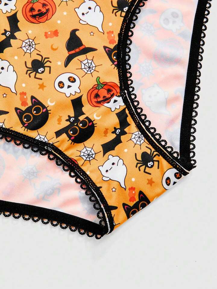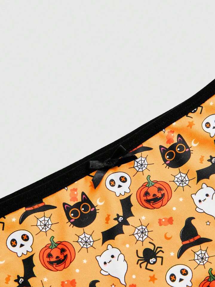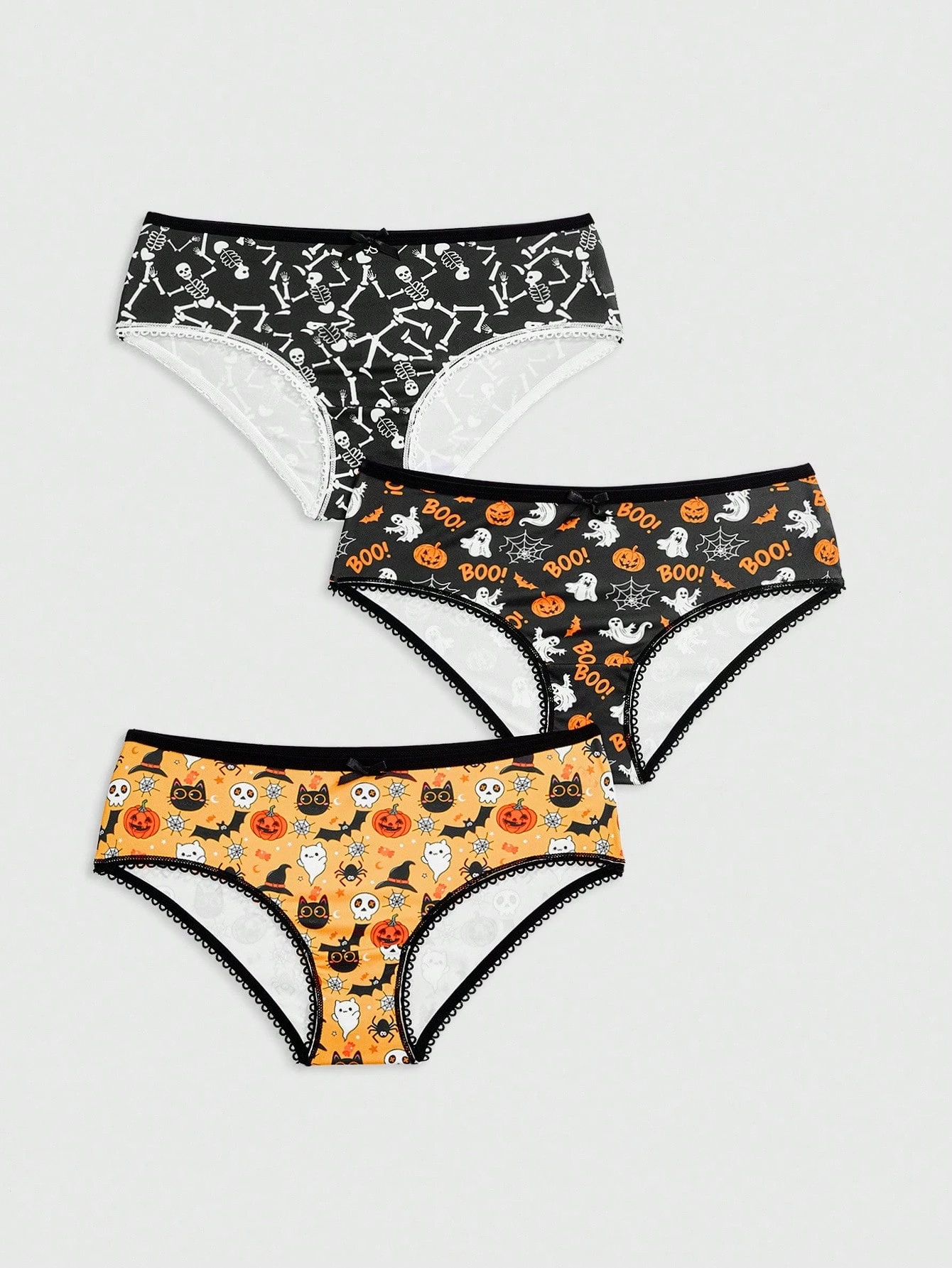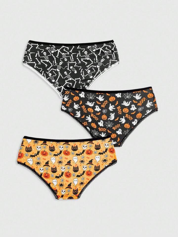 Kawaii 3pcs Halloween Dark Pumpkin, Ghost, Skeleton, Black Cat, Bat, Spider Web Print Comfortable Panties For Women