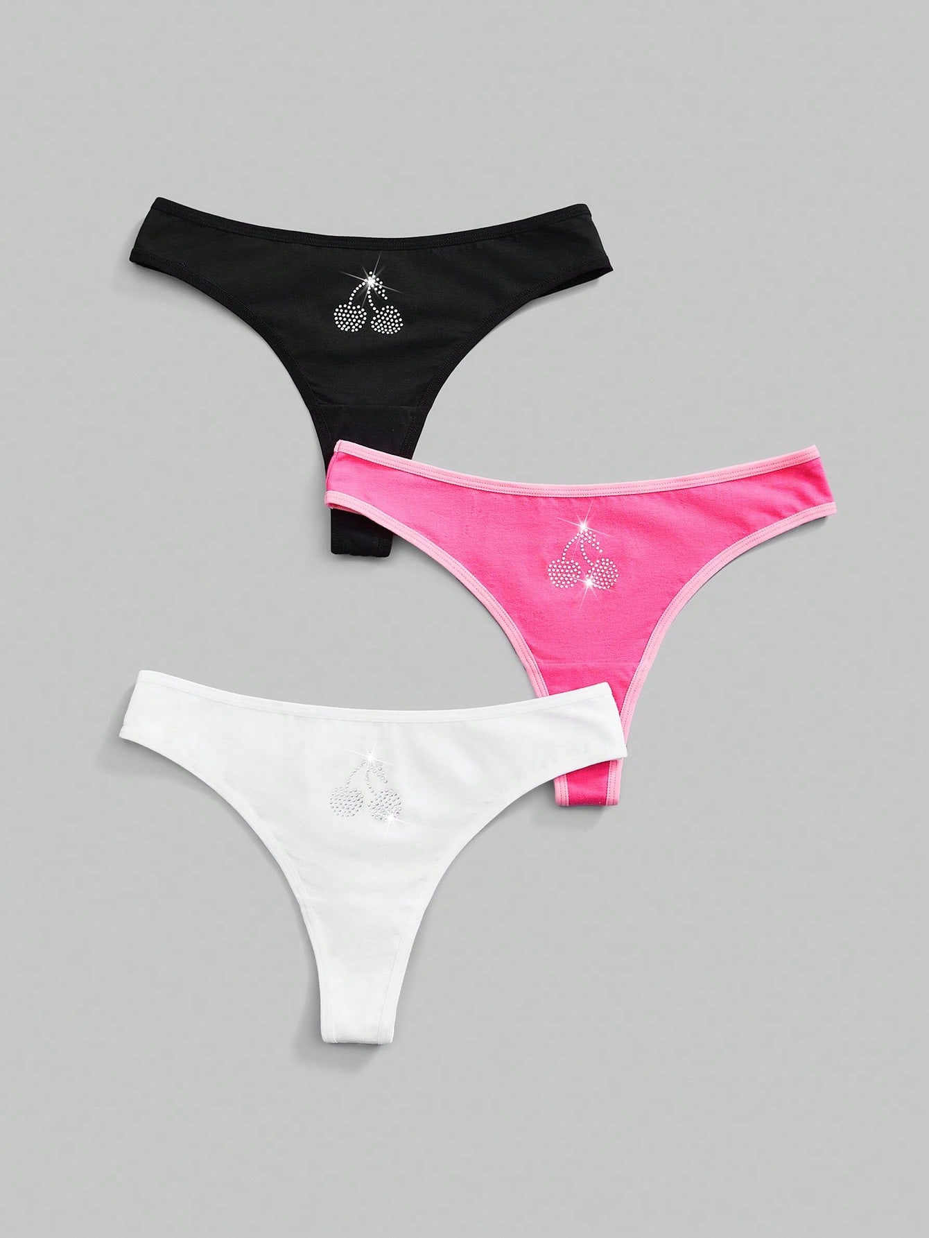 Kawaii 3pcs/Set Sexy Solid Color Cherry Rhinestone Decor Thong Panties, Comfortable