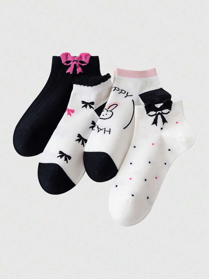 Kawaii 4 Pairs Women Cartoon Cute Bow Simple Campus Style Ankle Socks, All Season