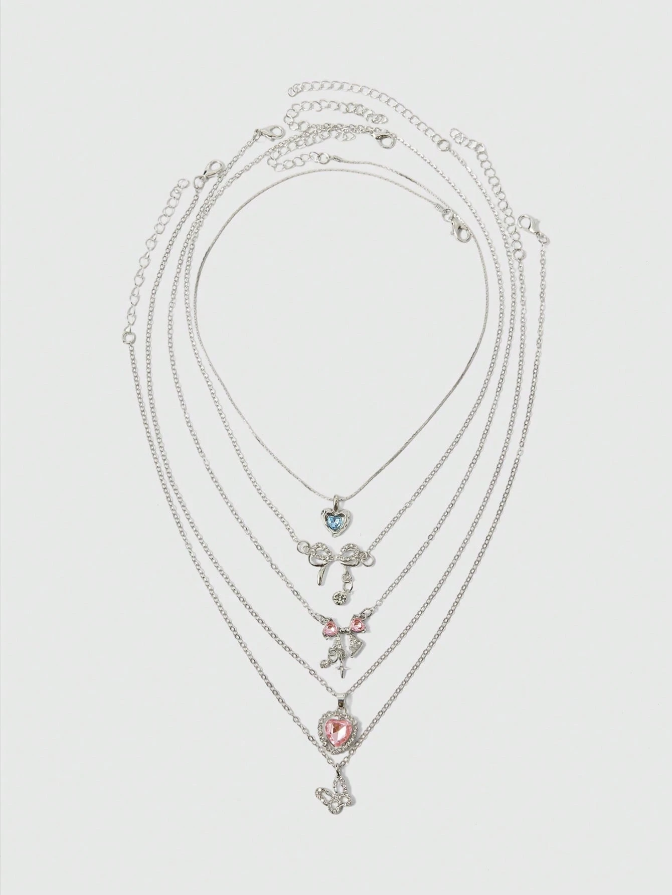 Kawaii 5-8pcs/Set Fashionable Y2K Crystal Heart, Butterfly, Tulip, Bow Pendant Necklaces Set, Shiny Jewelry, Gift For Women, Valentine's Party