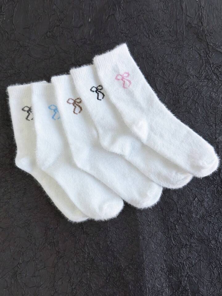 Kawaii 5 Pairs Random Color Cute Bowknot Plush Socks, Warm Mid-Calf Socks, Cute JK Style White Socks, Casual And Versatile Ladies Socks