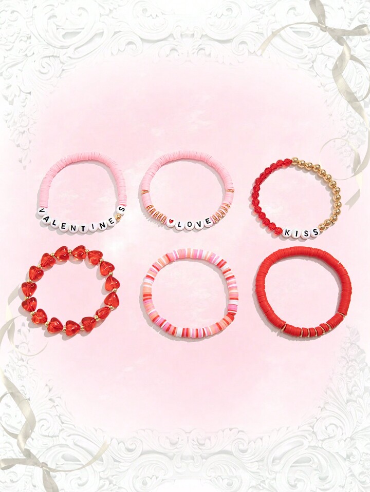 Kawaii 6pcs Fashionable Sweet & Cute Heart-Shaped Alphabet Beaded Bracelet Set For Women, Suitable For Daily Wear Or As A Gift For Friends Or Valentine's Day