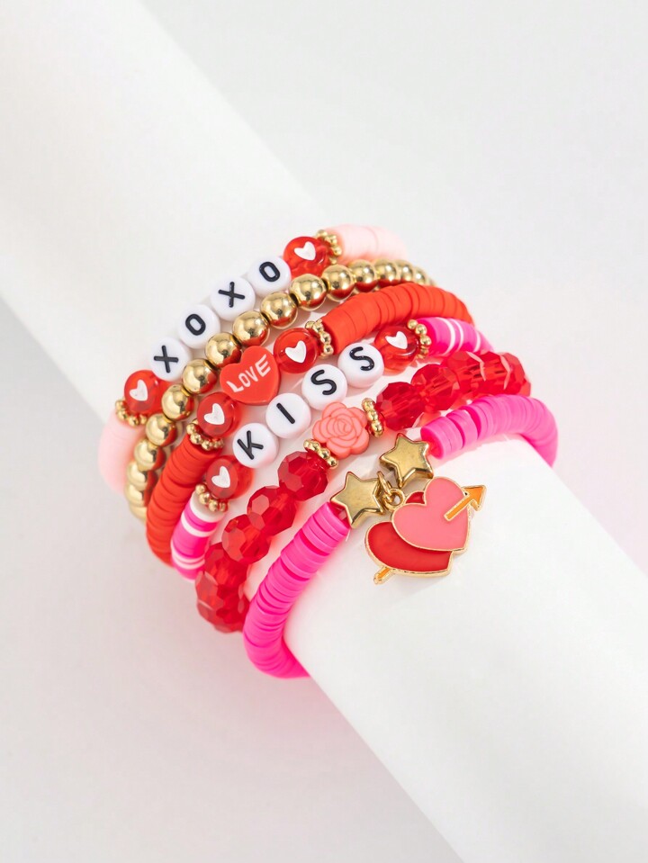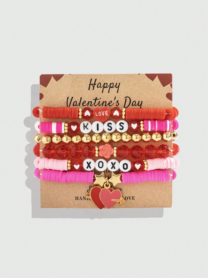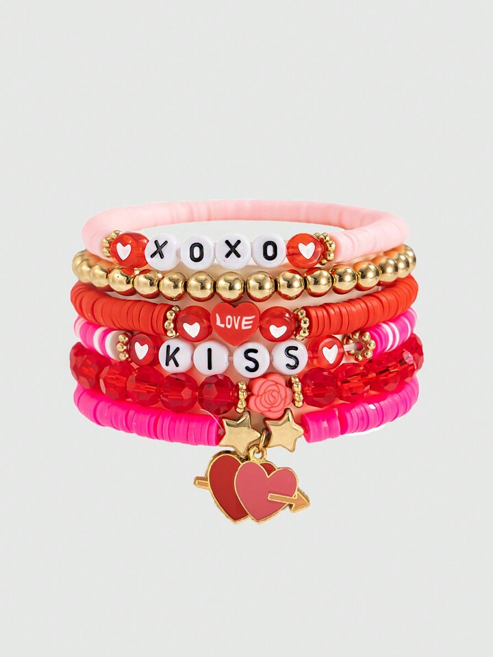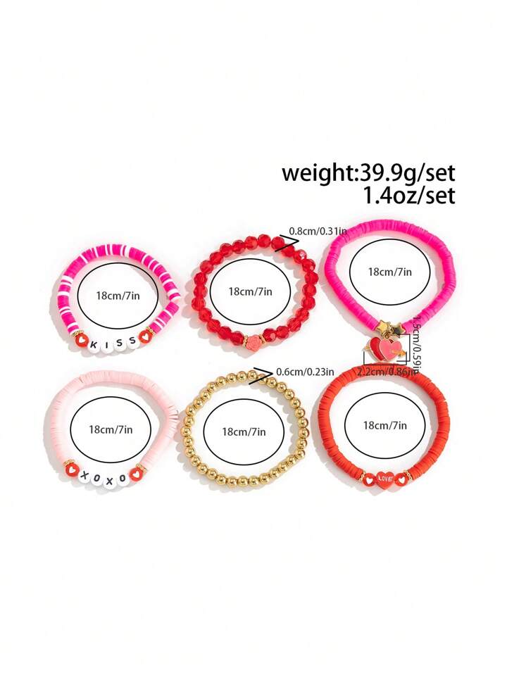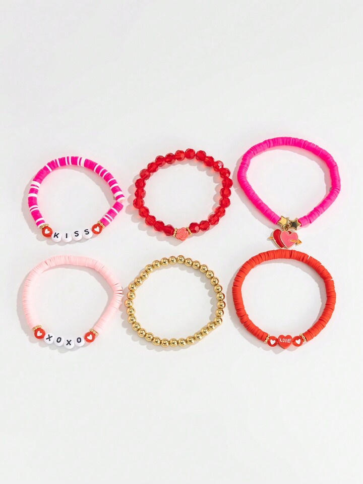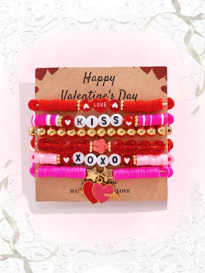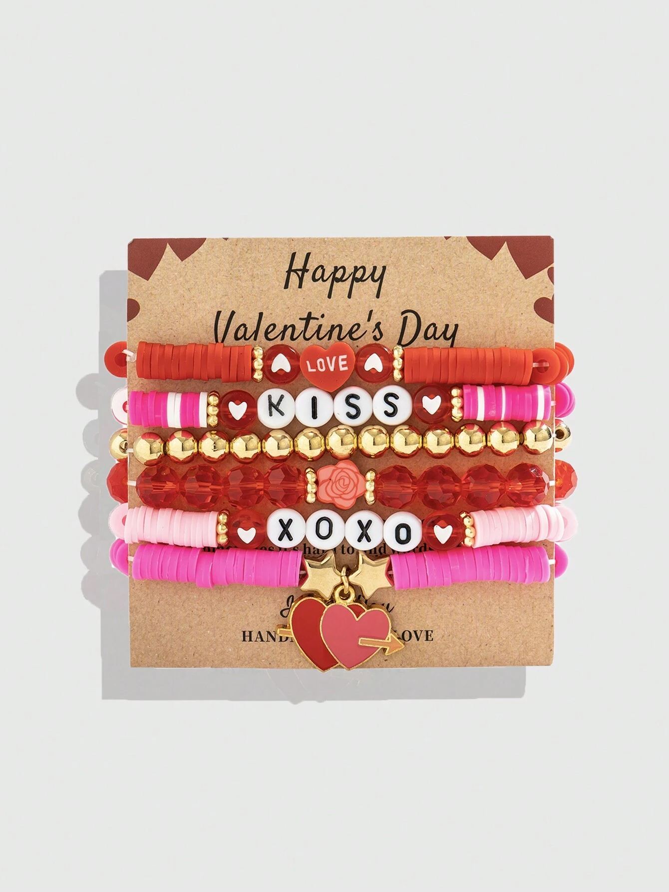 Kawaii 6pcs Romantic XOXO/KISS Letter Beaded Pink Valentine's Day Bracelet Set, Gift For Wife/Friends
