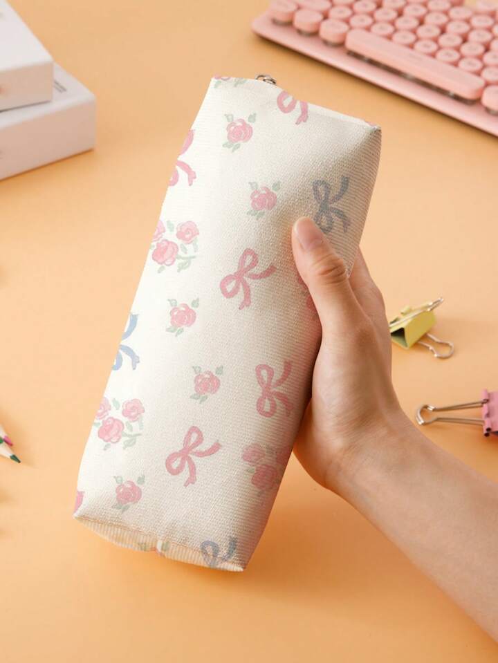 Kawaii Bow & Flower Pattern Double-Sided Printed Pencil Case With Bowknot Decoration, School