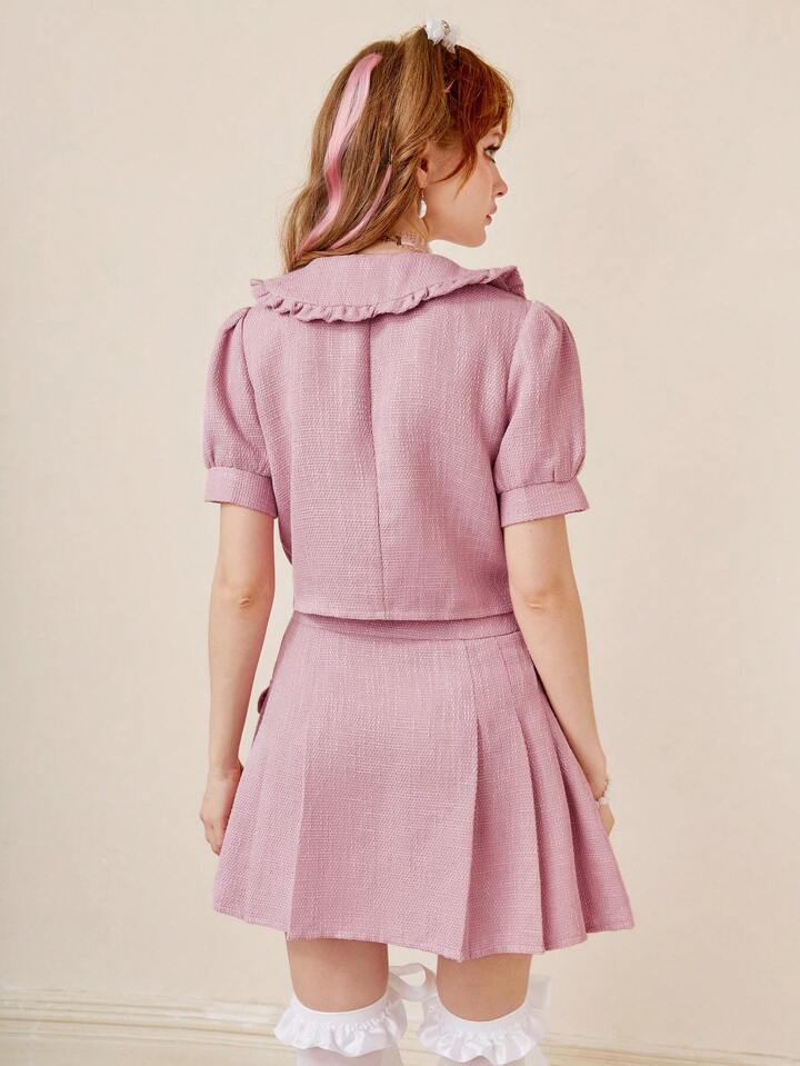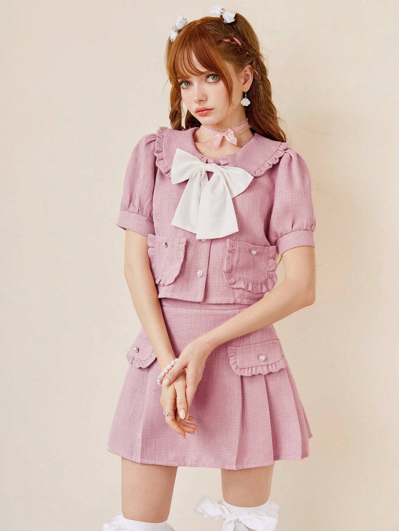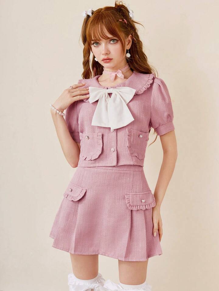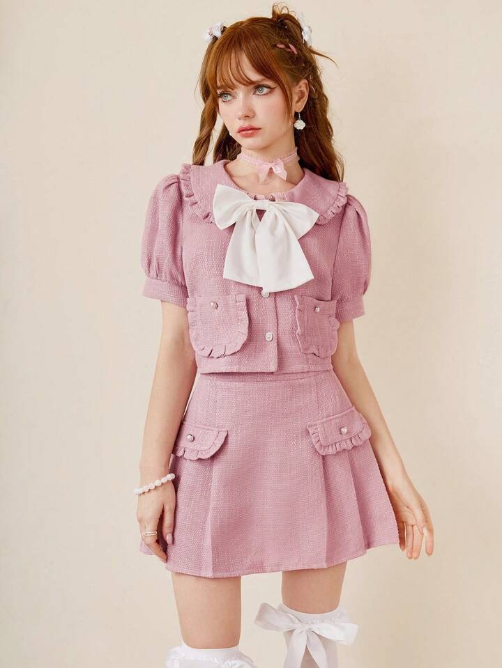 Kawaii Bow Front Puff Sleeve Jacket & Pleated Skirt