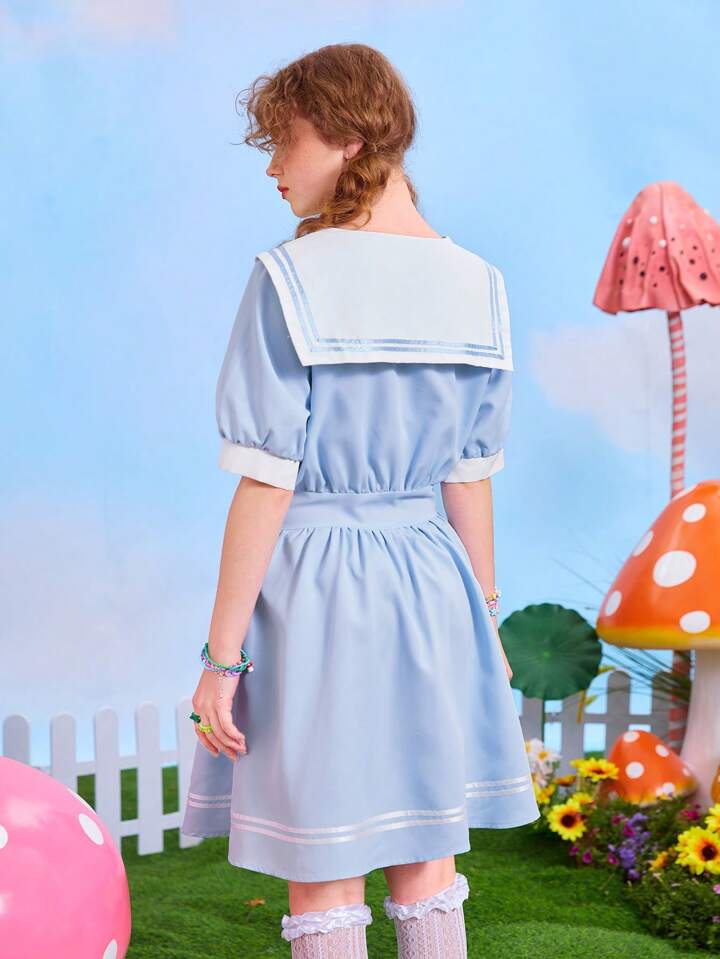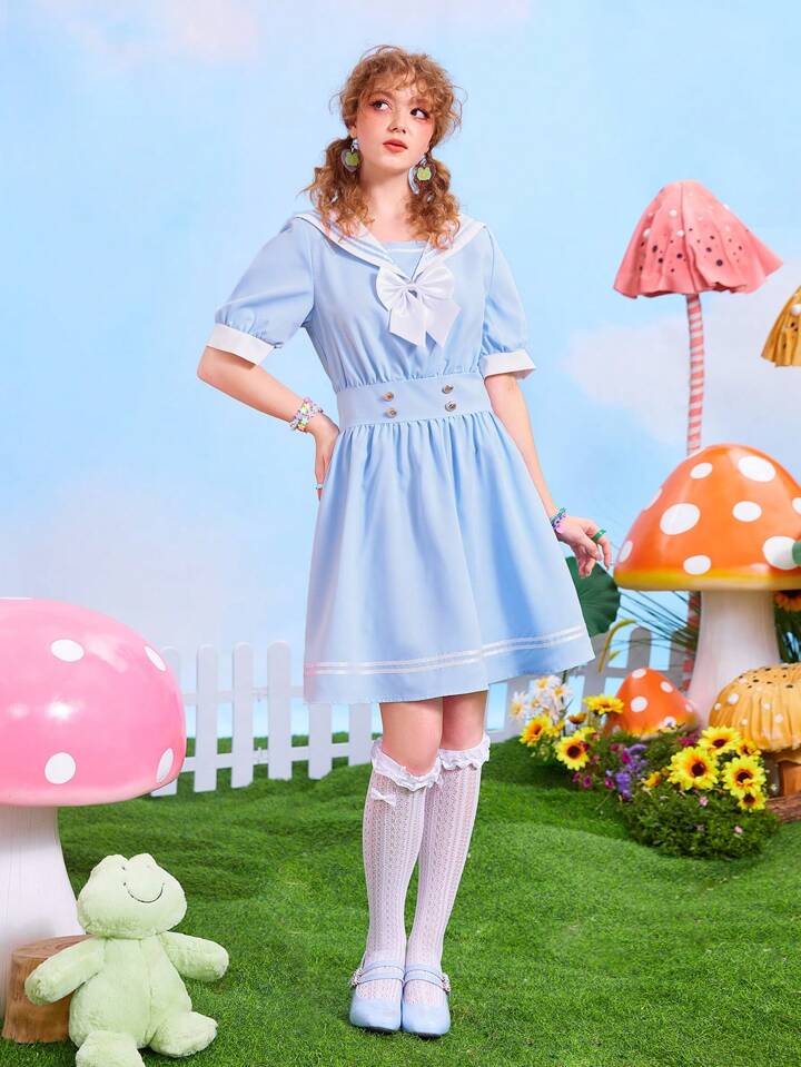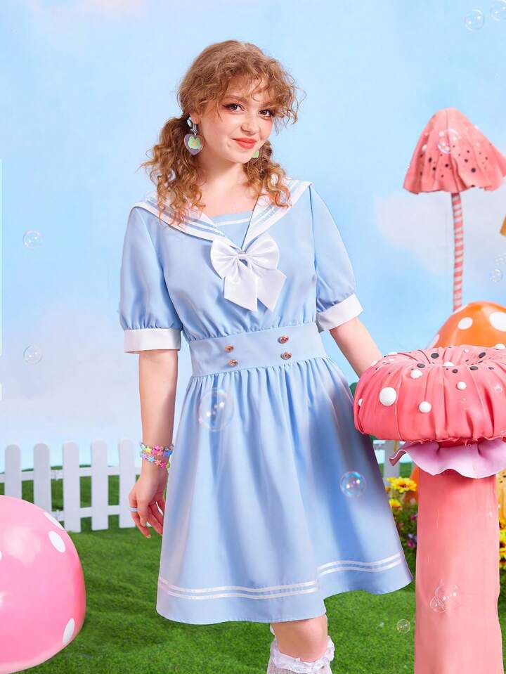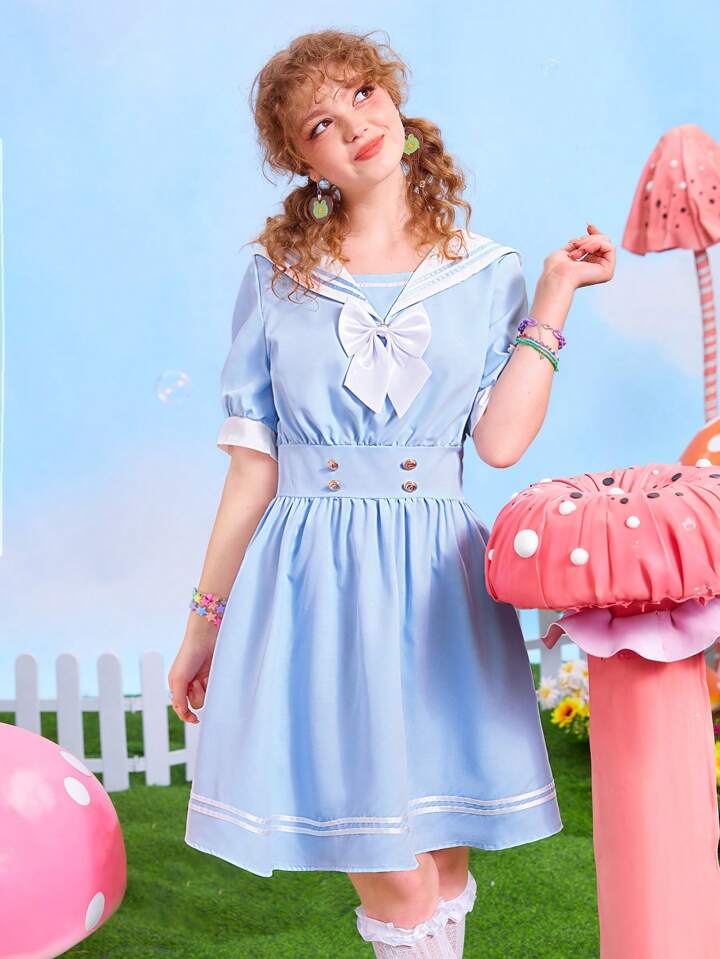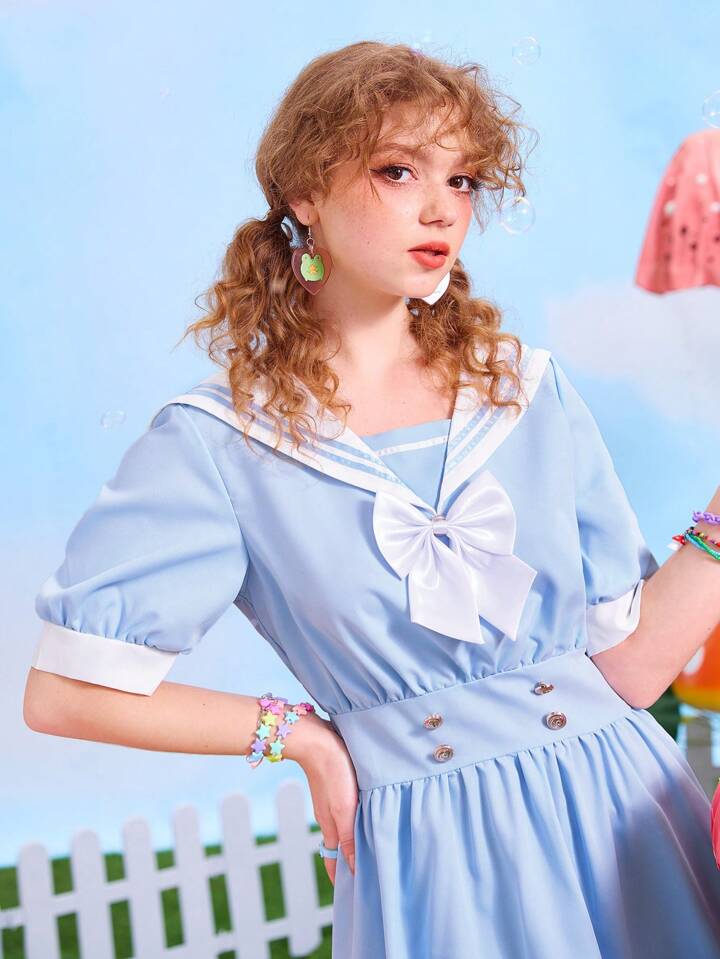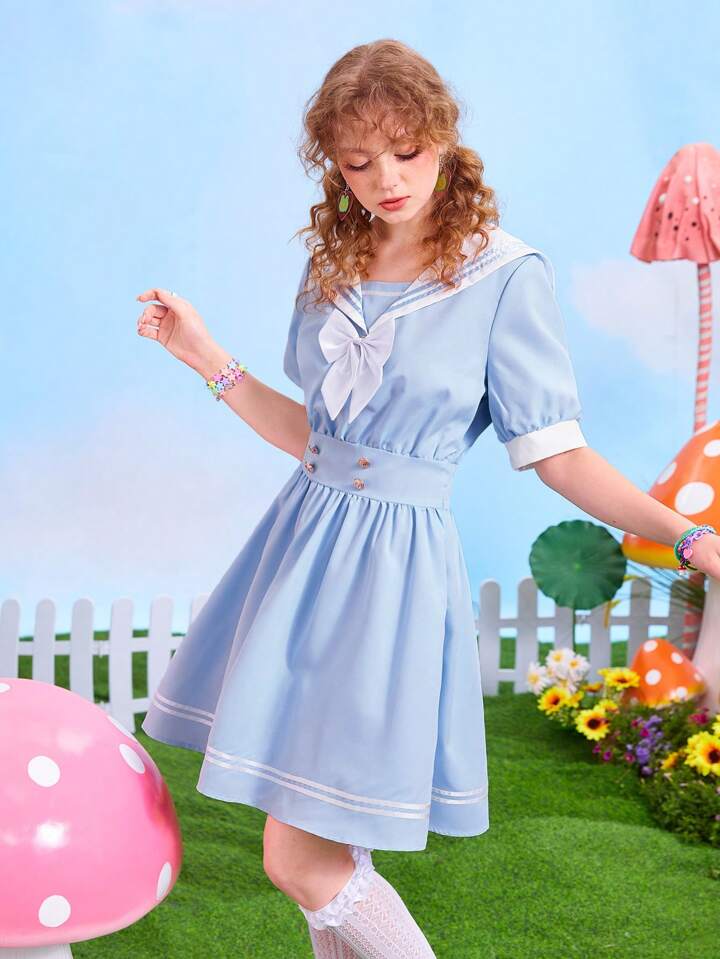 Kawaii Bow Front Sailor Collar Puff Sleeve Dress