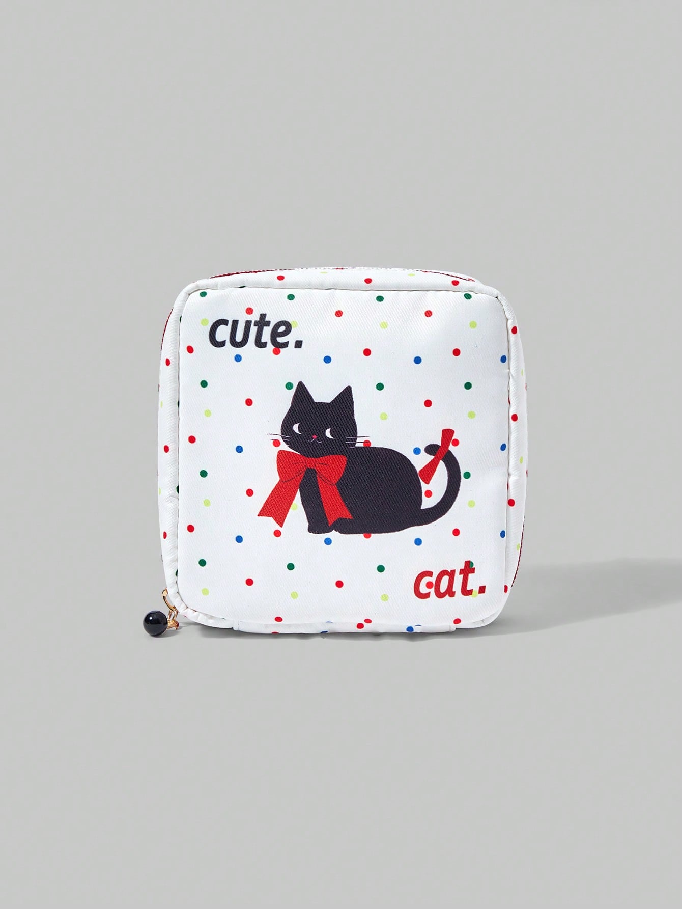 Kawaii Cartoon Cute Colorful Polka Dot Black Bowknot Cat Printed Thickened Padded Large Capacity Portable Cosmetic Bag, 1440731
