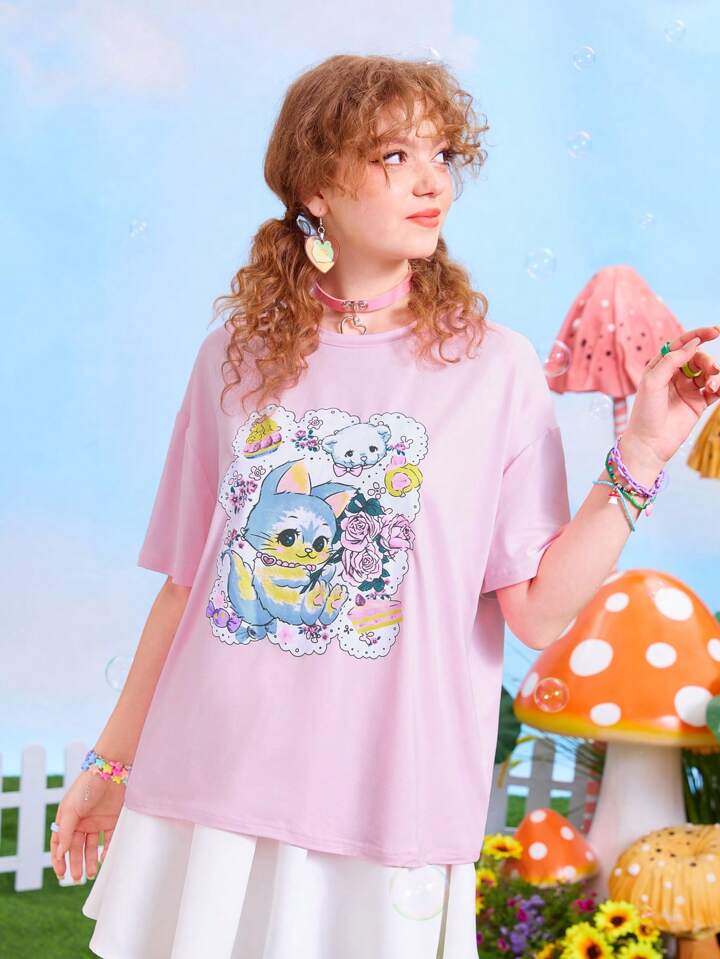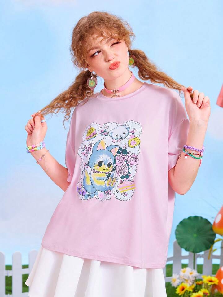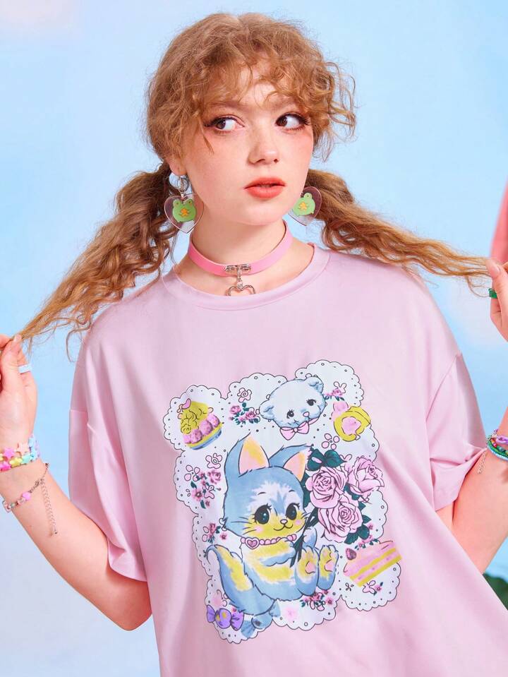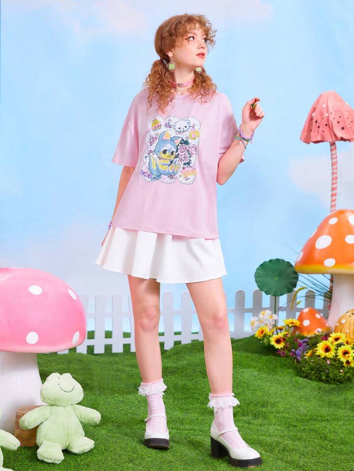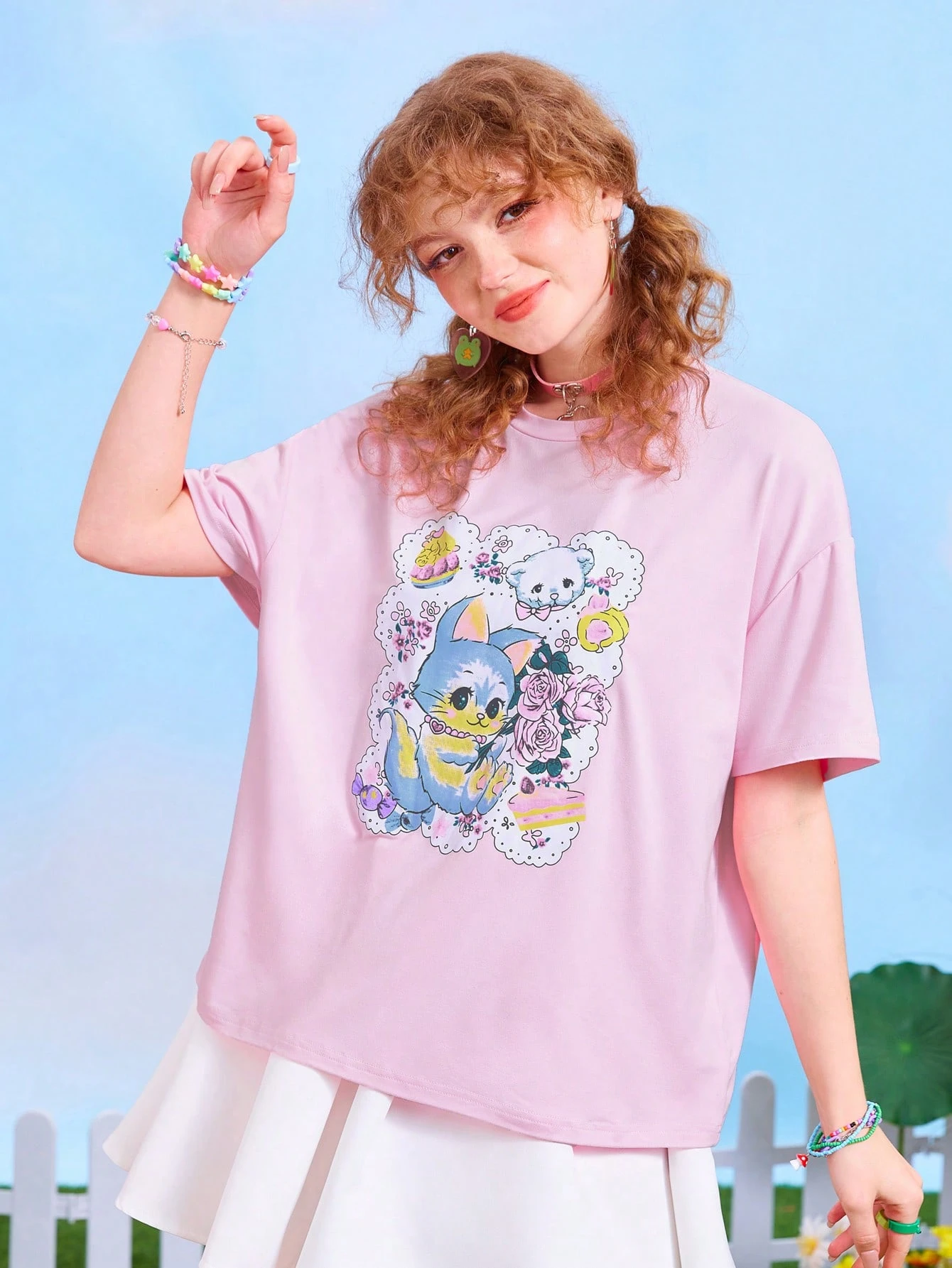 Kawaii Cartoon Graphic Drop Shoulder Tee