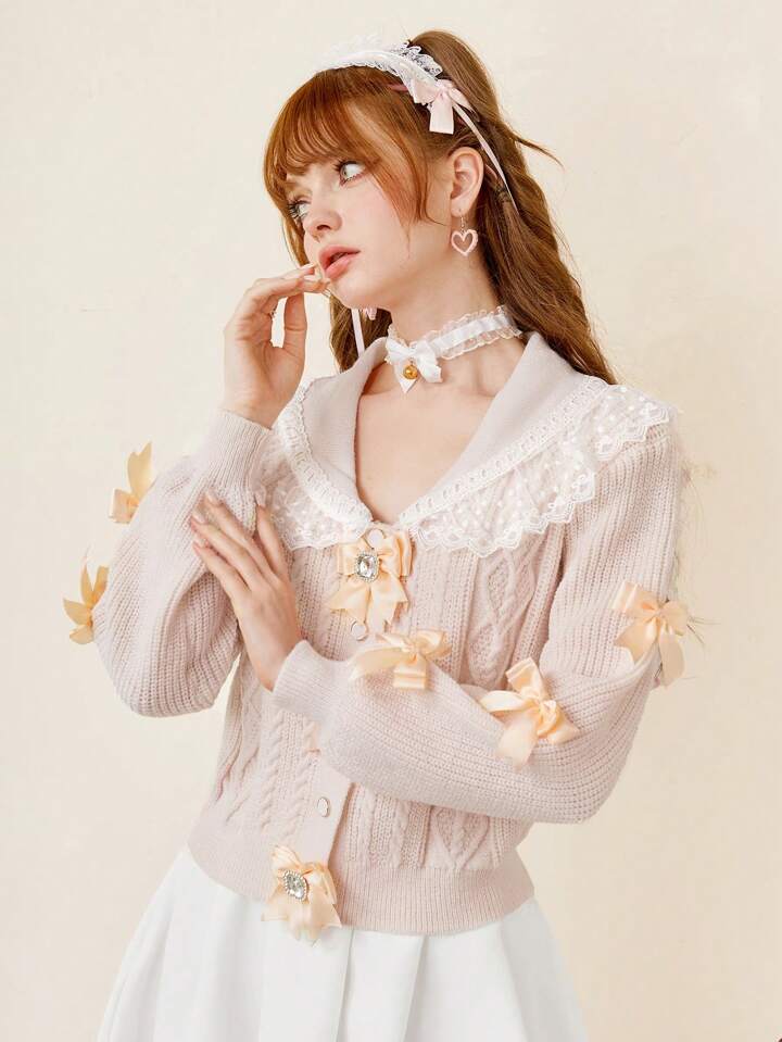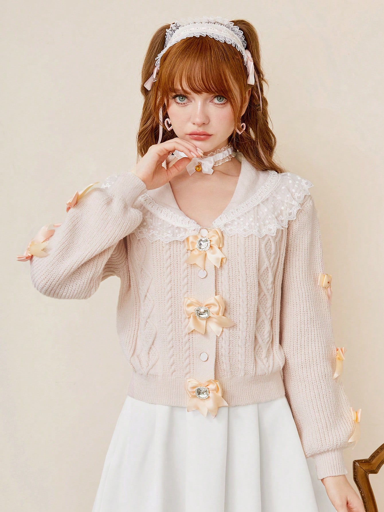Kawaii Contrast Lace Bow Front Cable Knit Cardigan