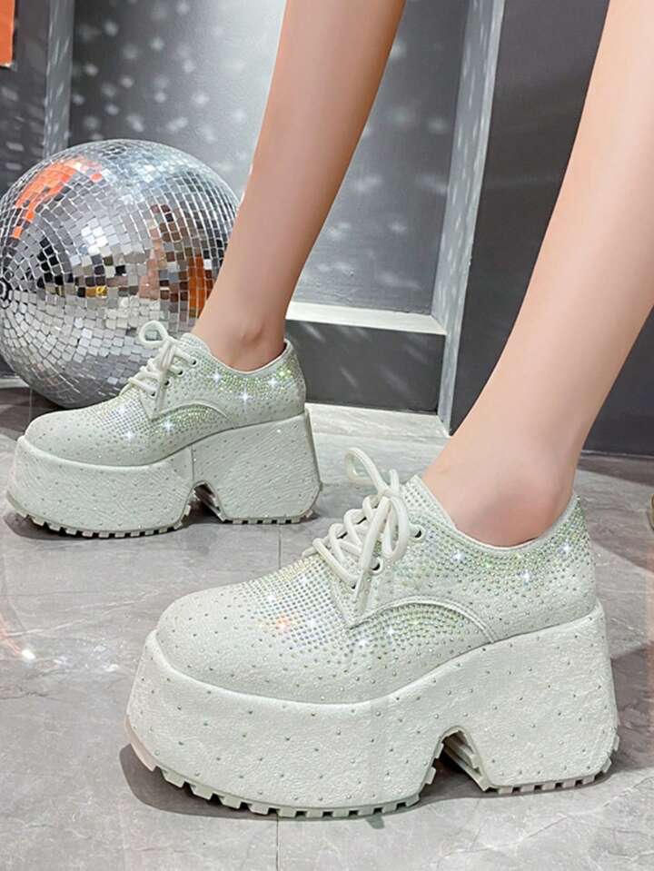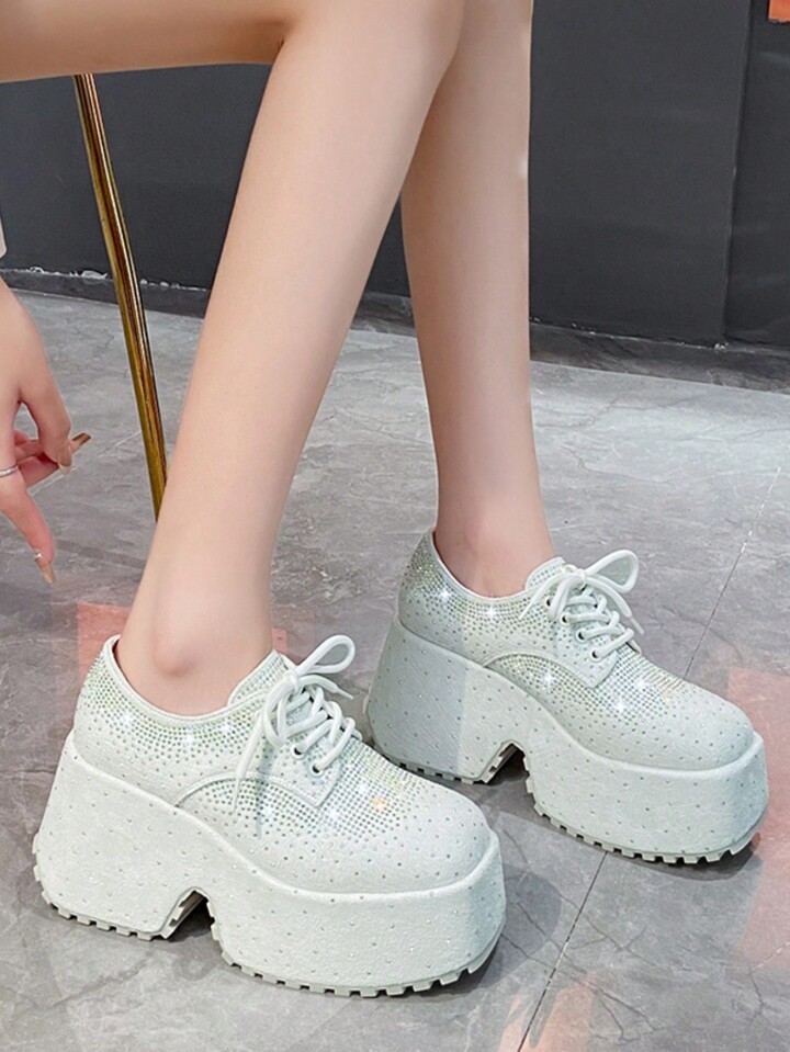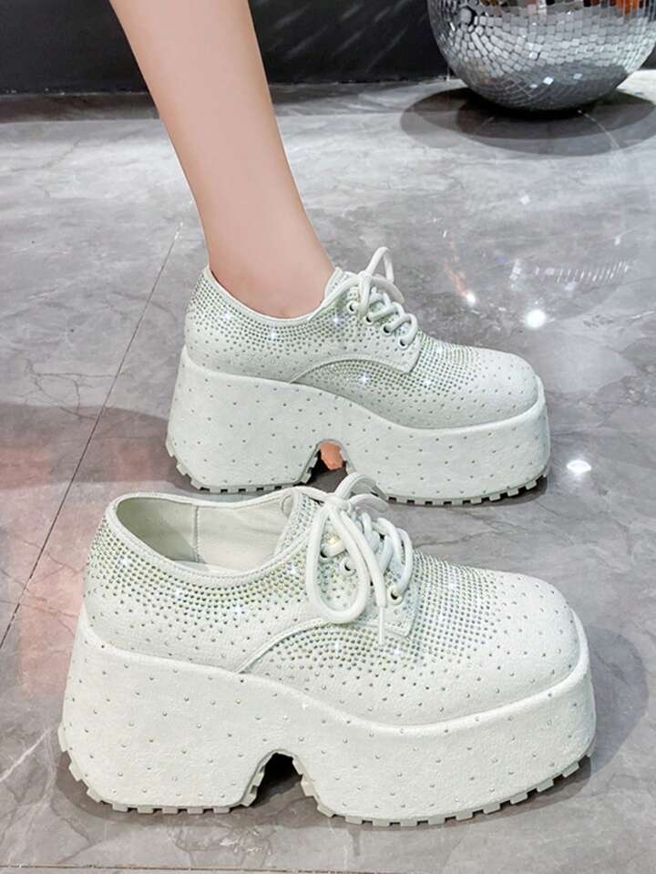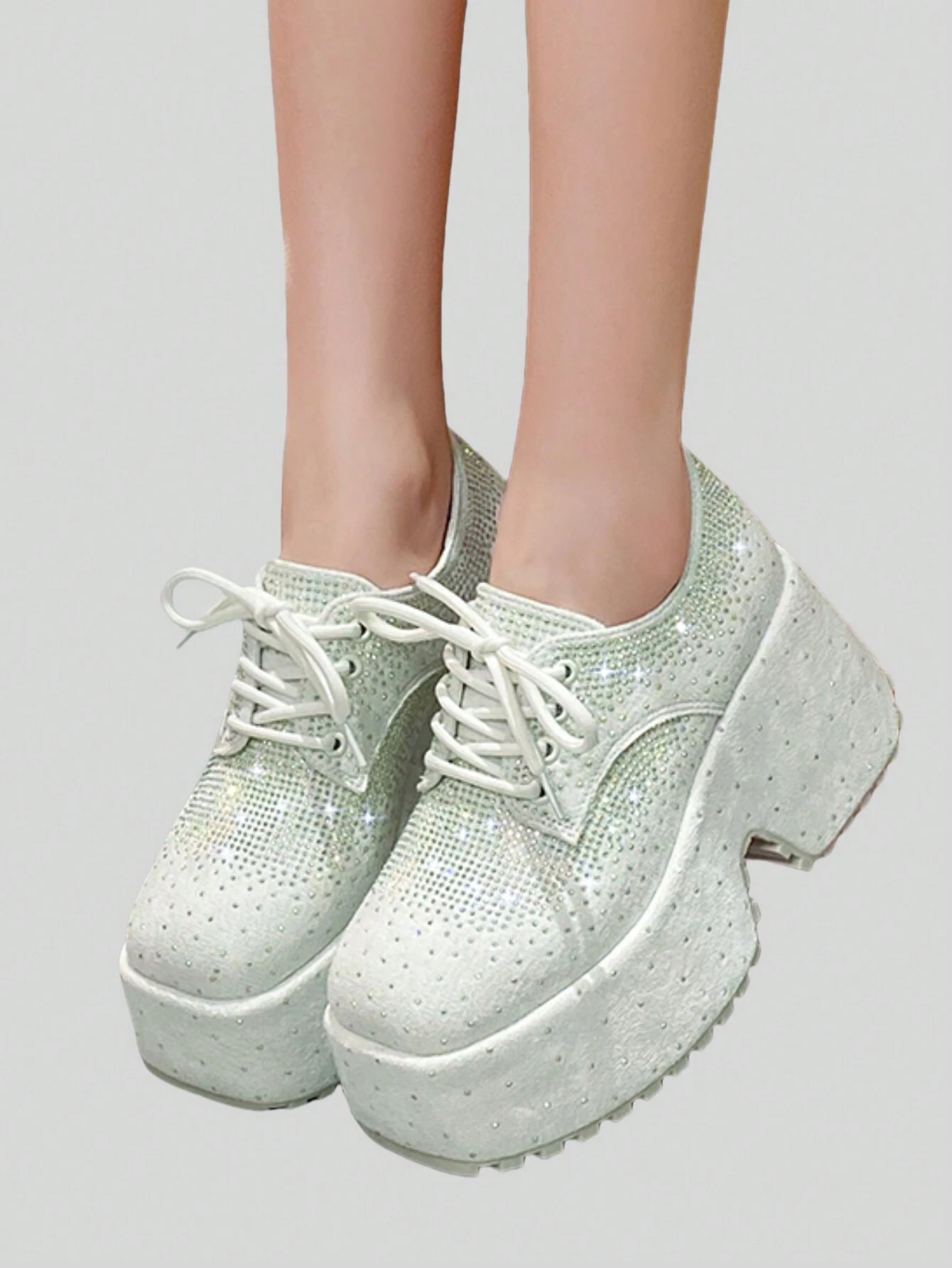 Kawaii Cream-Color Platform Rhinestone Embellished Loafers For Women, New British Style Casual Slip-On Flat Shoes