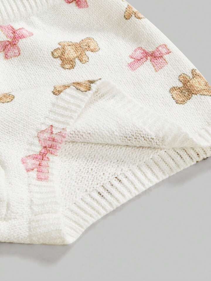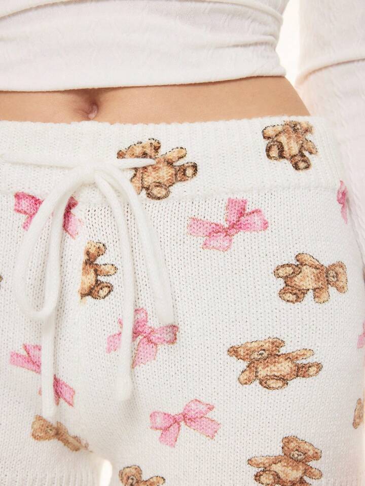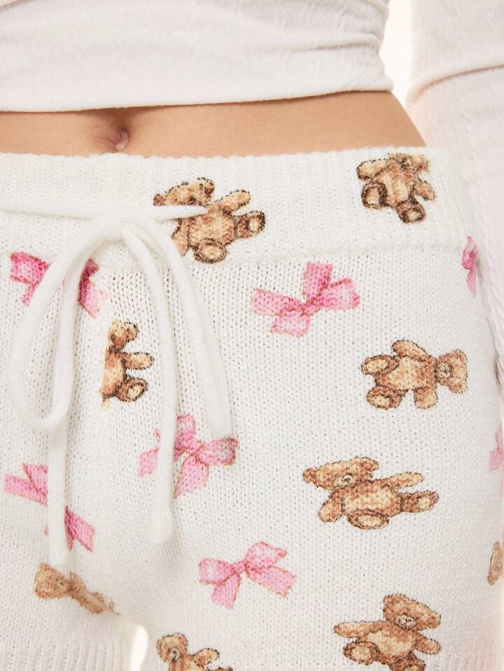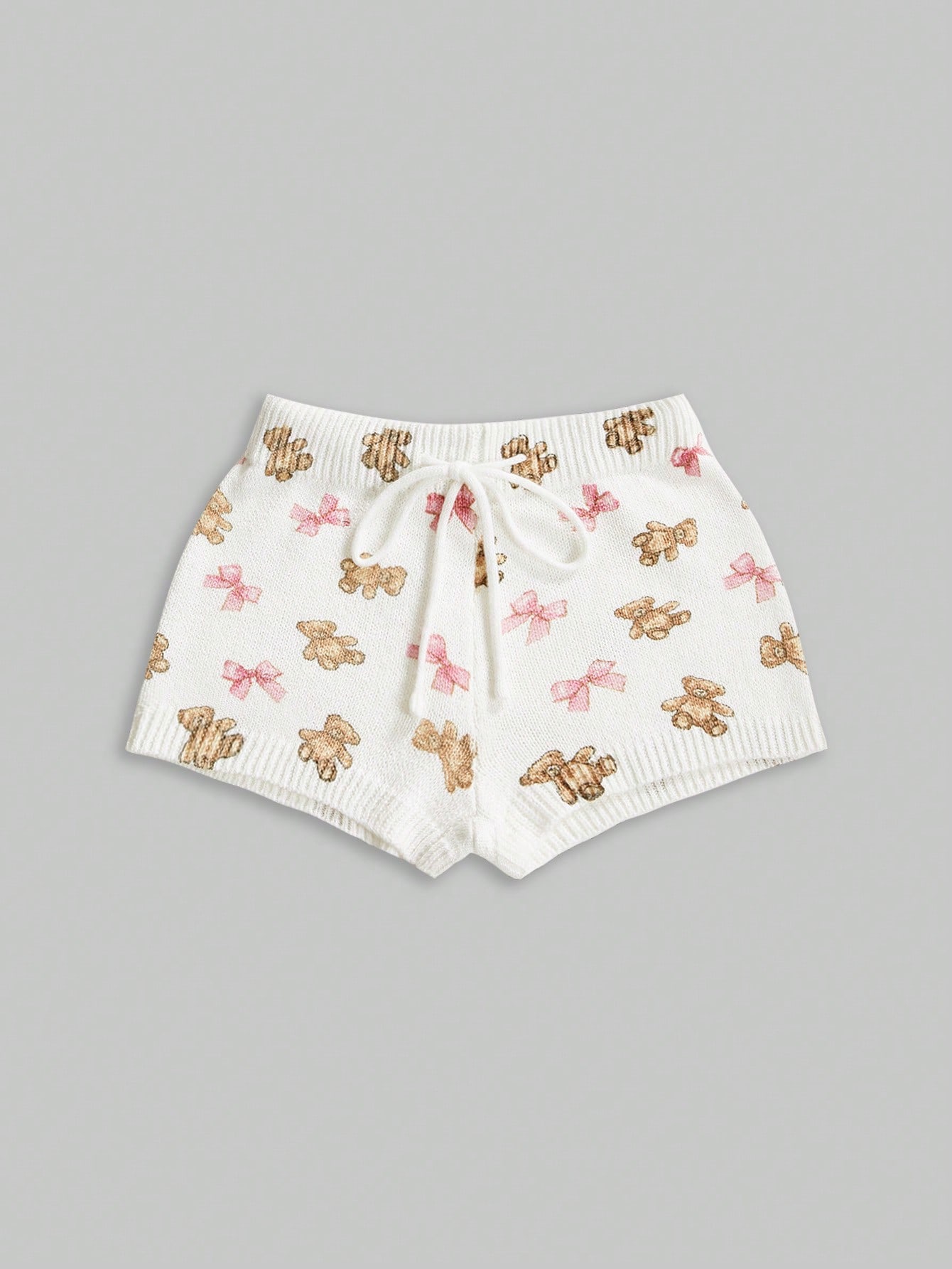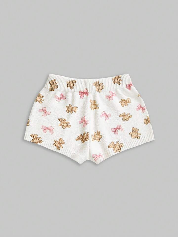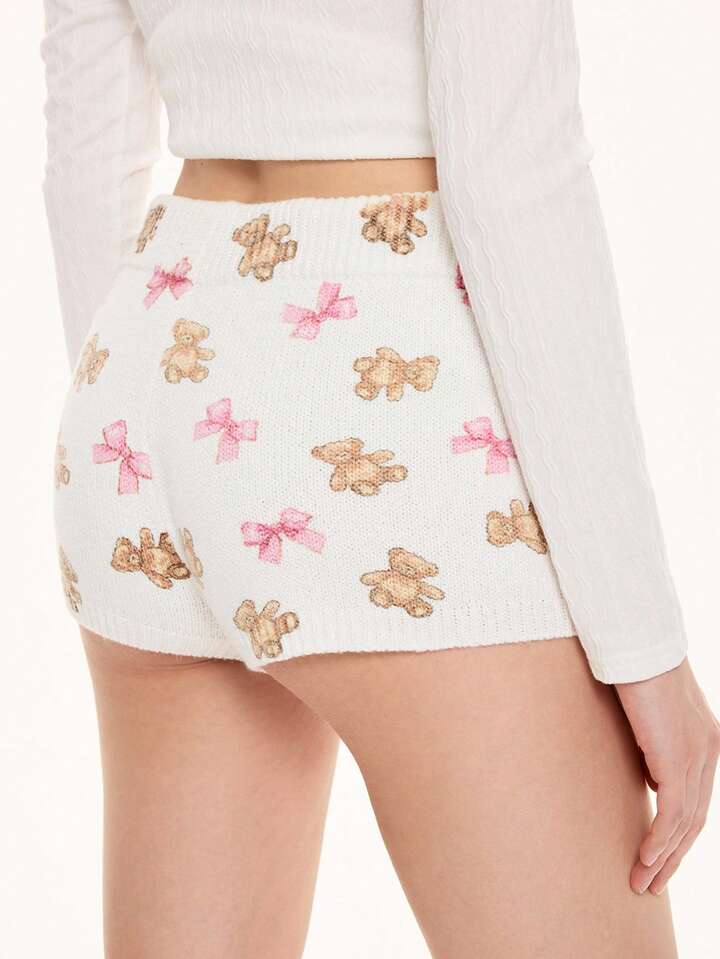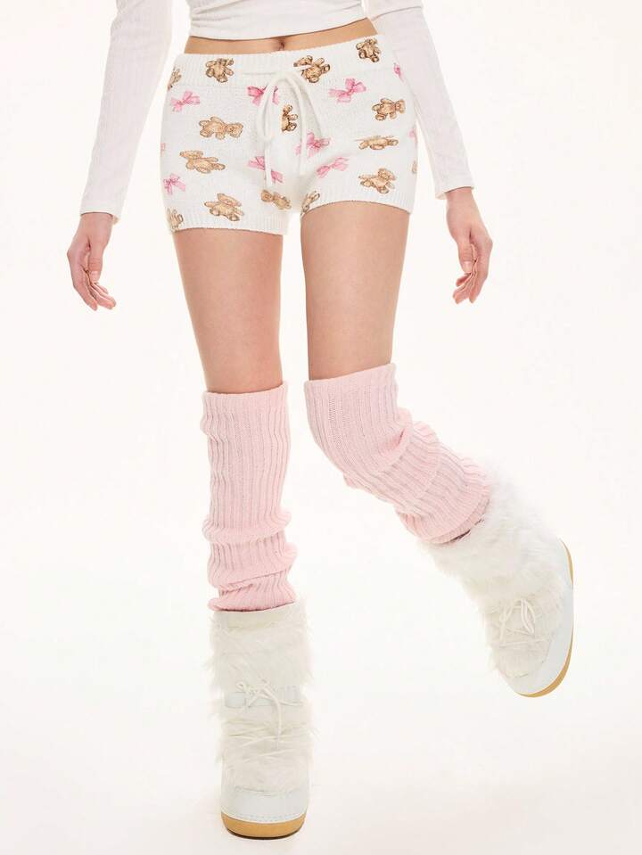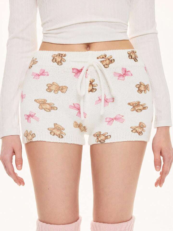 Kawaii Cute Bear & Bow Drawstring Elastic Waist Knitted Women's Low-Rise Shorts