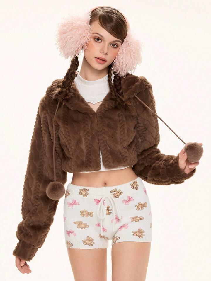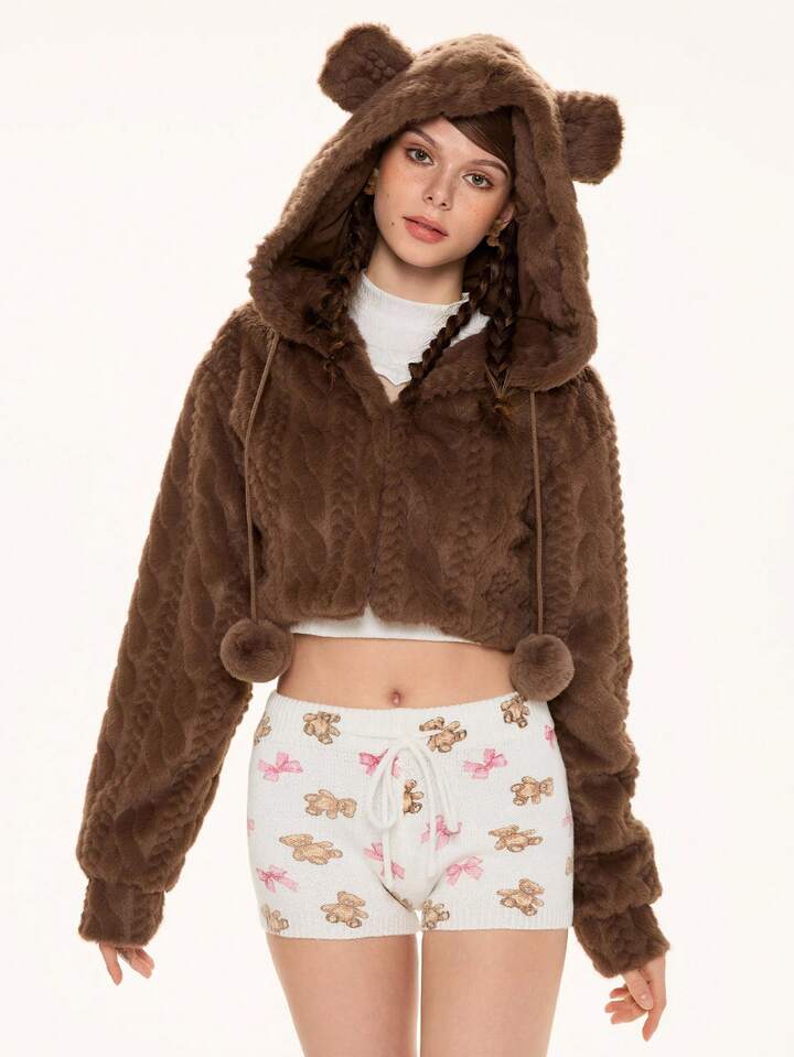 Kawaii Cute Bear Ear Hooded Fuzzy Ball Short Jacket
