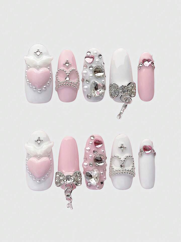 Kawaii Cute Lace Edged Romantic Heart Ballerina Style Bow White Wings Metal Music Note Pink Series Handmade False Nail Tips, Mass Produced Energetic Girl Wear, Suitable For Daily Outings And Dates