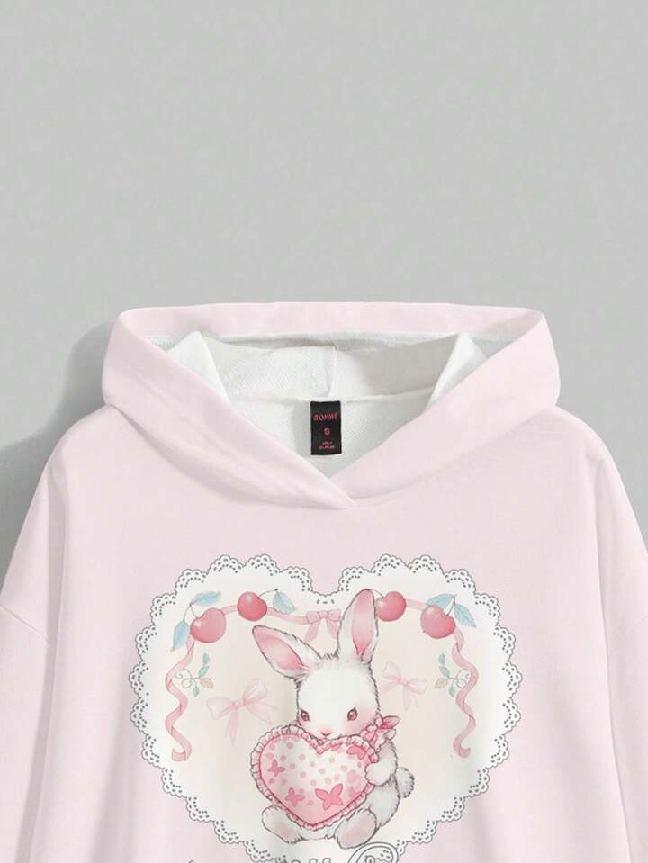 Kawaii Cute Rabbit & Pink Heart Slogan Print Loose Fit Hoodie Sweatshirt For Women, Autumn/Winter